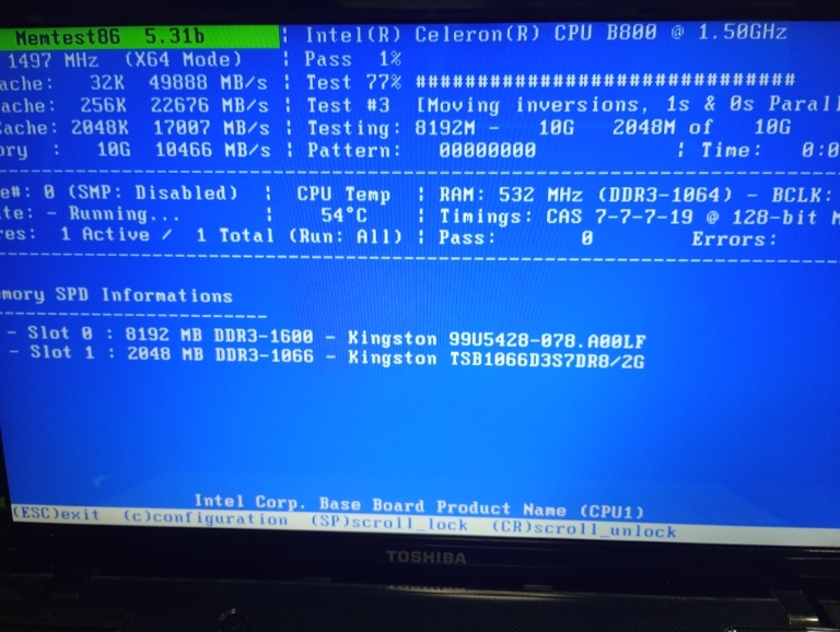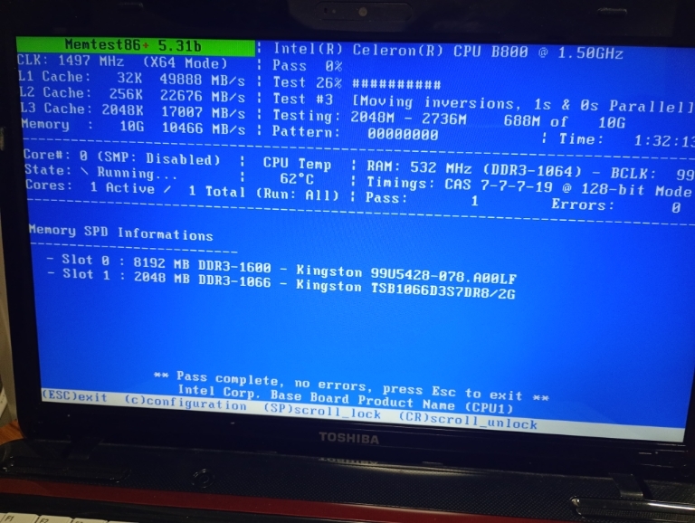 | 商 品 説 明 | ≪検査機≫: ・東芝T451/58ER改 (Cel B800) 画像 Memtest86+ 5.31b 1ラウンドpass ≪Memtest86+ 5.31b ≫ 画像 ▲右中段 RAM: 532MHz (端数無視) DDR3-1064 (端数無視) タイミング: CAS 7-7-7-19 ▼左下段 スロット0: DDR3-1600 スロット1: DDR3-1066 ・右中段が動作している結果 ・左下段がメモリを挿された時点の物理的な結果 *********************************************** スロット0=画像1上● 8gb PC3L-12800 = Kingston スロット1=画像1下● 2gb PC3-8500 = Kingston 上段のメモリが下段のロースペックに引きずり込まれて DDR3-1066 計10gb として動いている形です。 どうしても DDR3-1066 で動かす必要がある方向け。 お手持ちパーツの組合せにより【ご自身でこの形を造れる方】は、わざわざ当商品を購入なさる必要がありません。 |