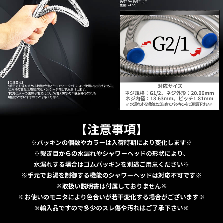 | 送料無料!!! 送料及び下記のご案内をご確認の上、ご入札お願い致します。 離島地域を除く九州、四国、本州まで送料無料。 ※北海道は+1000円、離島地域及び沖縄県は+3000円にて承ります。(発送前に加算) ※画像内にカラー及びサイズ等の選択が可能と記載がある場合がございますが、 お届けする物はタイトルまたは商品説明文に記載の物です。 ★※注文後のカラー変更や異なるカラー・サイズ指定等は一切承っておりません。 ※★※仕様(ロゴデザイン/ロゴ有無等も含む)は予告なく変更する場合があります。 ※多少の汚れや小傷がある場合がございますがご了承ください。 梱包は簡易包装ですので、箱の角落ち等はご了承願います。 【蛇腹式取り替え用シャワーホース 1.5m 】 取付簡単なシャワーホースですっ! 豪華なメッキタイプ! 漏れ防止パッキン採用! 外ホースはステンレス製で耐久性抜群 お風呂の掃除もラクラク スタイリッシュなデザインでどんな浴室にもマッチ 錆びにくく汚れもつきにくい ================= [デザイン] メタリックでクールなボディ。 どんな浴室にもなじみます。 スタイリッシュさも出せる高級感あるシャワーホース。 [蛇腹式] ねじれにくく使いやすい。 お風呂掃除の際や、ペットのシャワーの際にもとっても便利。 ================= [商品仕様] 長さ:1.5m 取り付け部分口径:(ネジ規格)G2/1 外径:20.96mm ※輸入時期により、ゴムパッキン等は個数・色が変更される場合がございます ※日本語説明書は付属しておりません ================= ※詳細は画像をご覧ください。 ![]() ![]() ![]() |