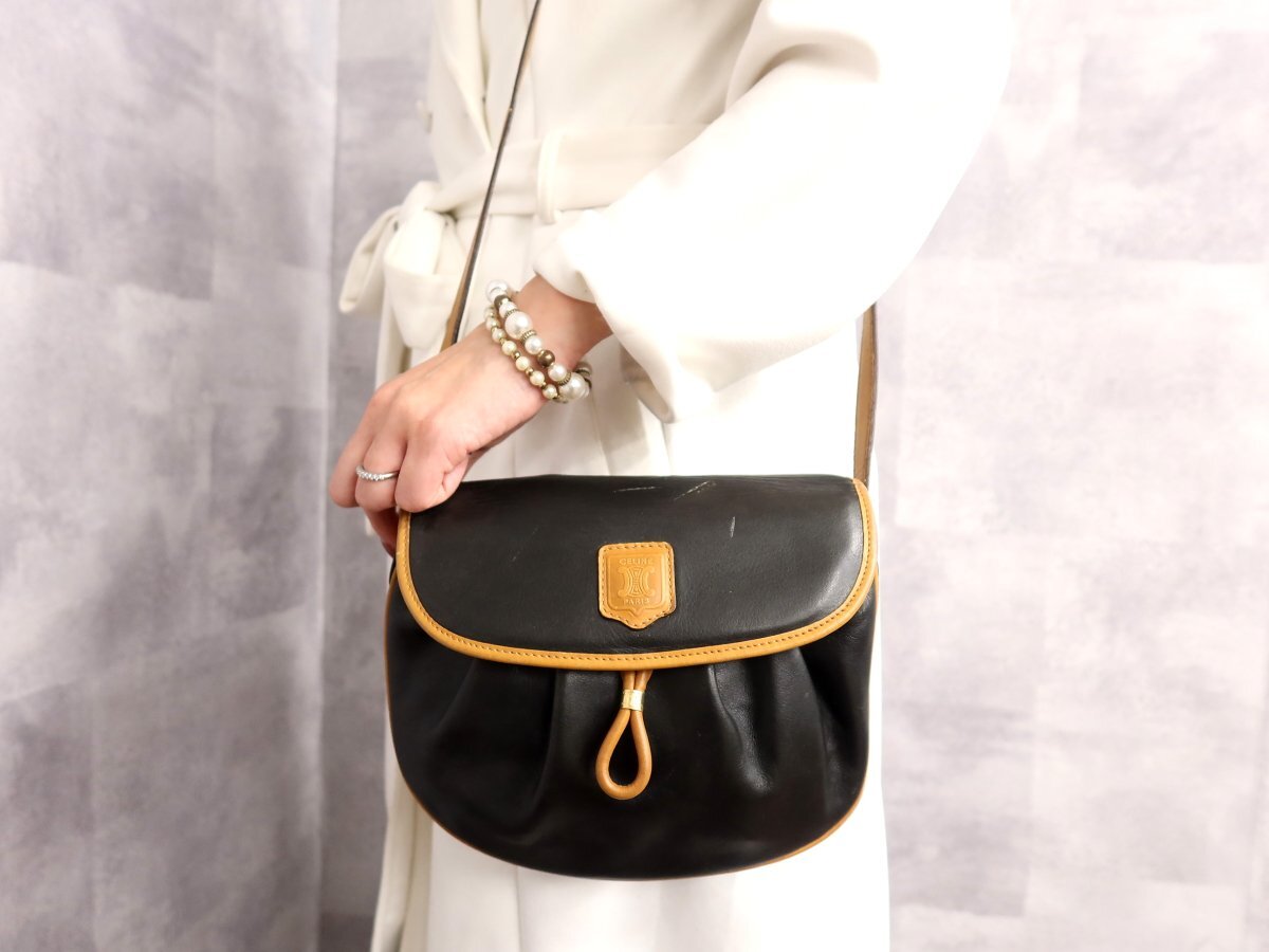 ●超美品●CELINE セリーヌ●カーフ レザー 本革●ショルダー バッグ●黒 キャメル●ゴールド金具●斜め掛け●ヴィンテージ●収納●Js63176