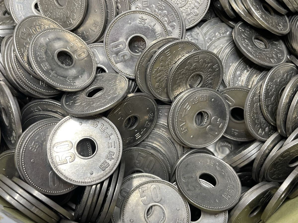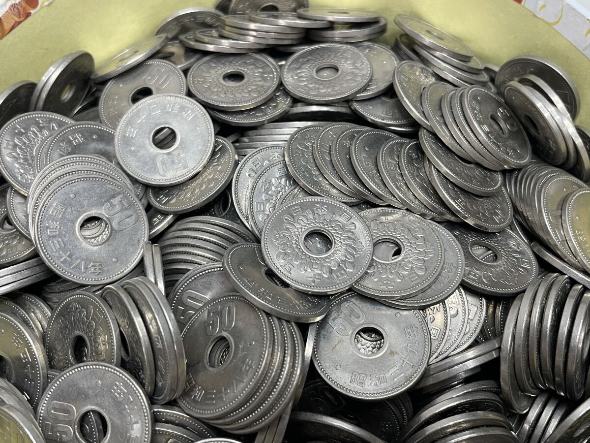 本品は昭和期の50円硬貨(穴あき)の大量まとめ売りとなります。