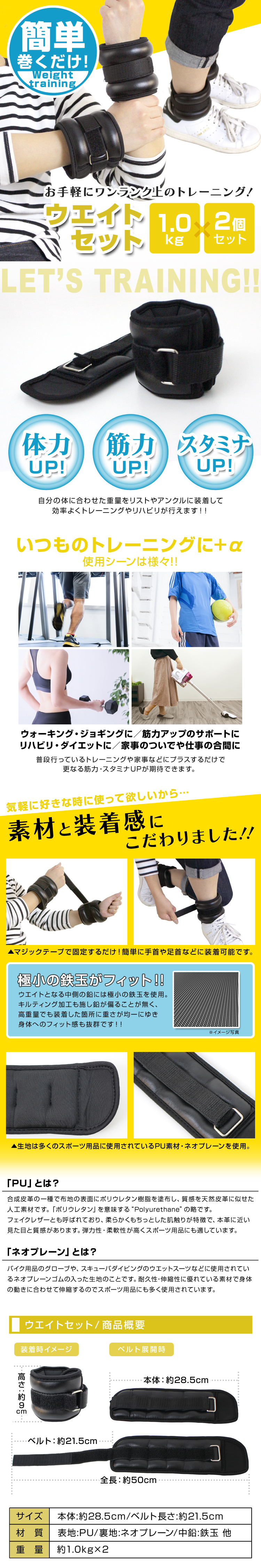 | 普段の生活から、ウォーキングやジョギング、エクササイズなど幅広く使用することができるリスト&アンクルウエイトです。 普段の生活の中で使用する事で自然にトレーニングすることができ、トレーニング時に使用する事で筋力アップのサポートになります。 トレーニング以外にもダイエットやリハビリにも最適です。 装着はマジックテープで固定するだけなので、とっても簡単です。 素材には伸縮性・耐久性に優れたネオプレーン(ゴム)を採用しています。 【商品仕様】 内容:リスト&アンクルウエイト 1.0kg ×2 カラー:ブラック 本体サイズ:(約)28.5cm×9cm ベルトサイズ:(約)21.5cm 重量:(約)(約)1.0kg ×2 素材:PU、ネオプレーン、鉄玉 他 【注意事項】 ・重量の表記は目安となります。若干の誤差が出る場合がありますのでご了承ください。 ・商品は、モニターによって色合いが異なって見える場合があります。 ・仕様・デザインは改良のため予告なく変更することがあります。 |