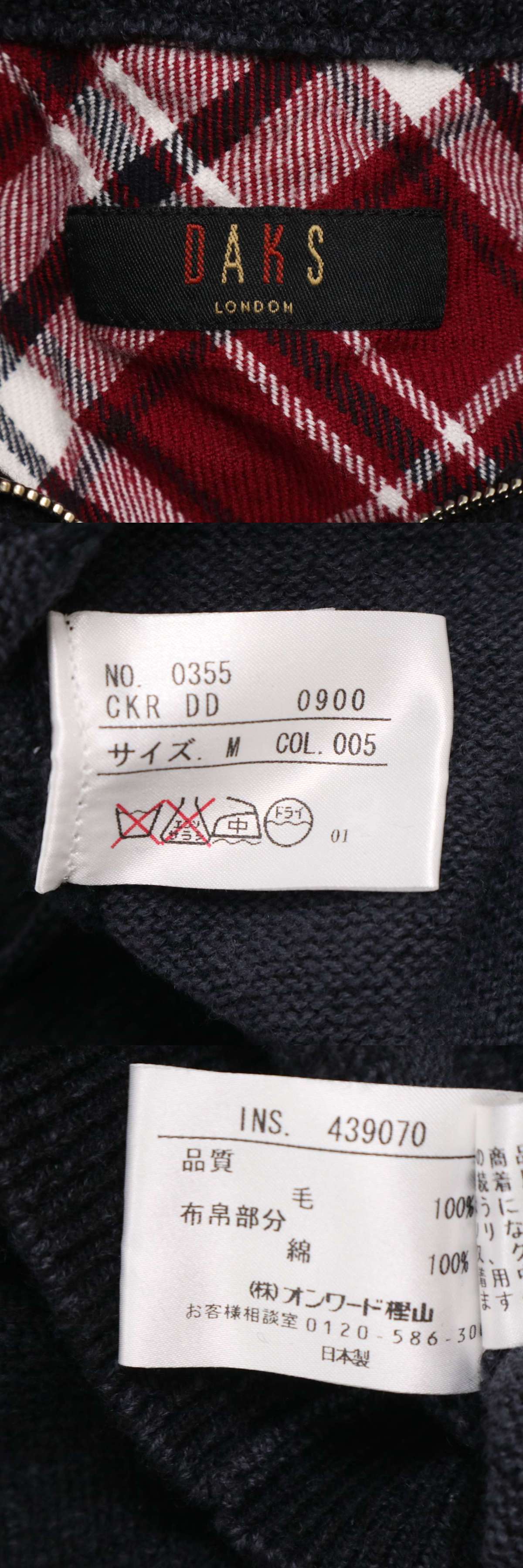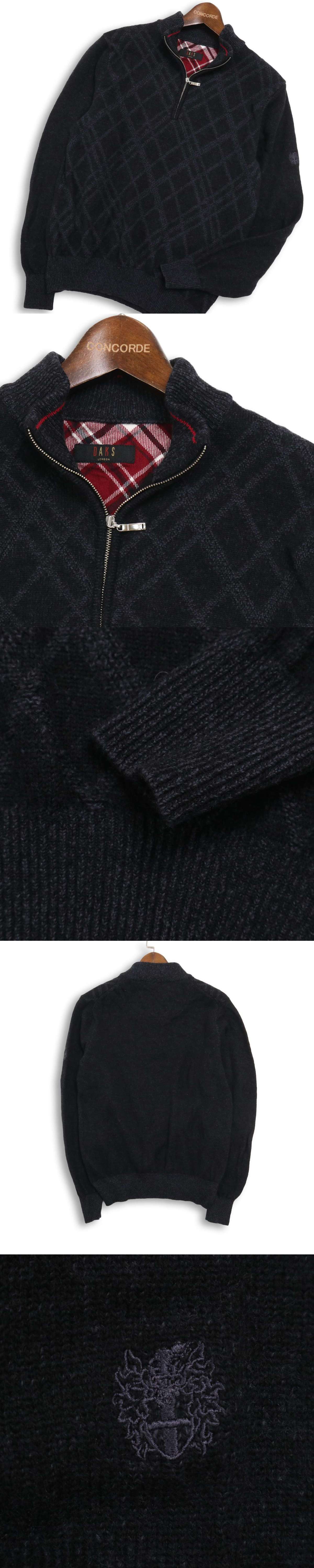 DAKS ダックス ロゴ刺繍★ ウール100% チェック ハーフジップ ニット プルオーバー セーター Sz.M メンズ グレー 日本製