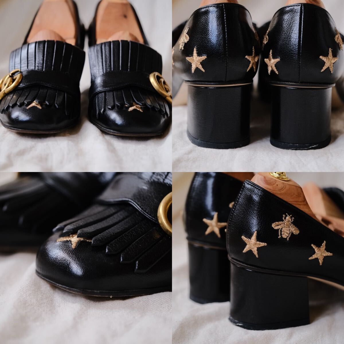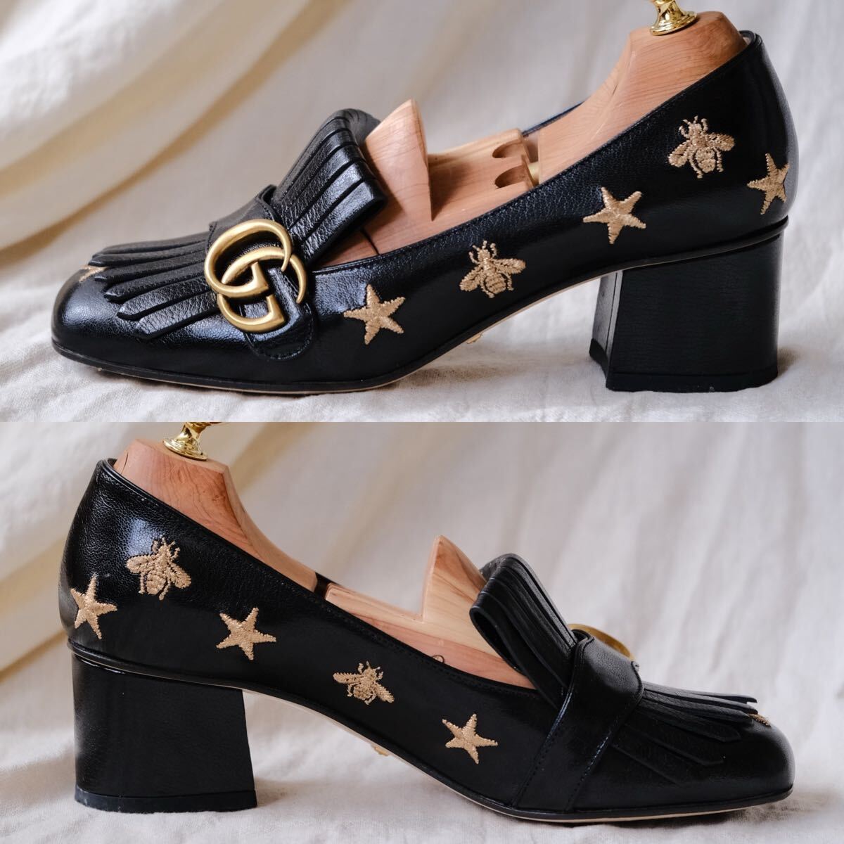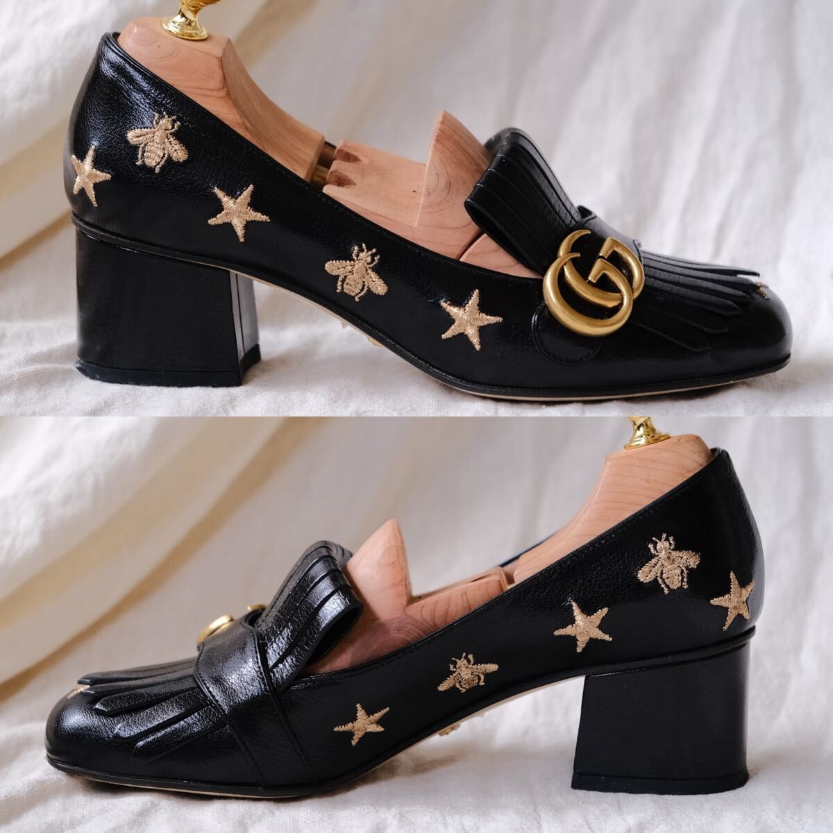GUCCIグッチのアイコン、ビッグGGマーモントバックルをアクセントにスター&ビーのエンブロイダリー柄キルティミッドヒールパンプス。ヒールはレザー張りで可愛さと高級感が最高次元で融和した希少ピース。