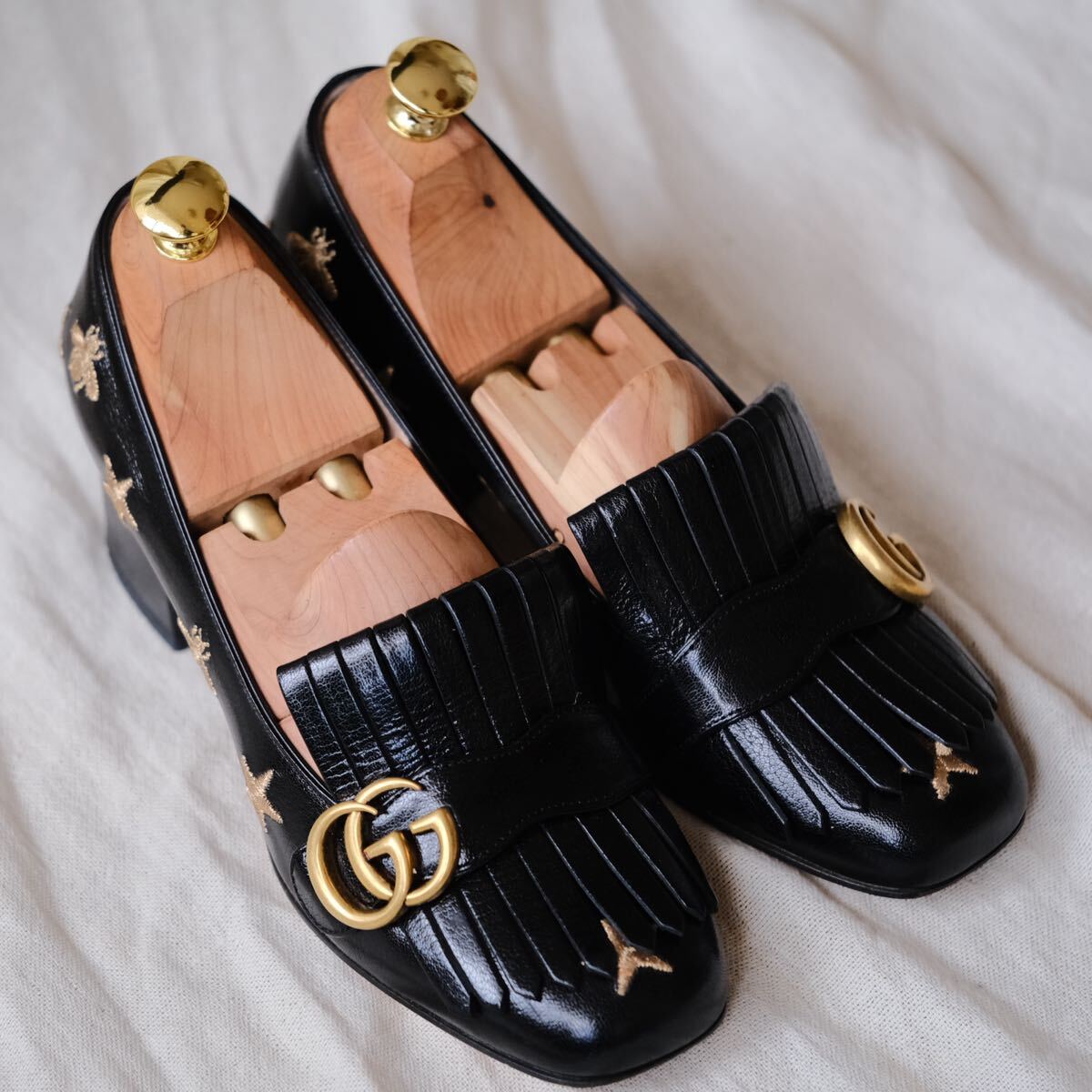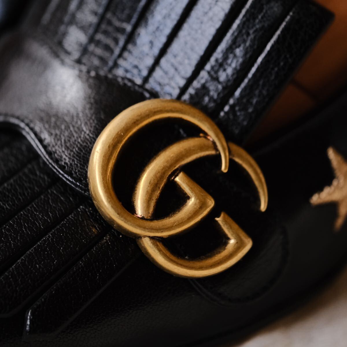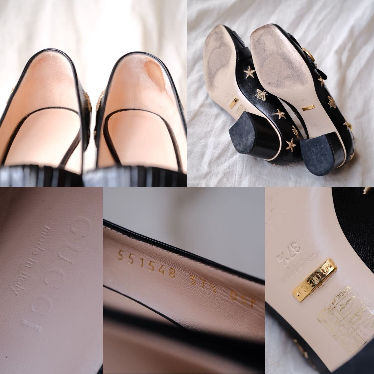 GUCCIグッチのアイコン、ビッグGGマーモントバックルをアクセントにスター&ビーのエンブロイダリー柄キルティミッドヒールパンプス。ヒールはレザー張りで可愛さと高級感が最高次元で融和した希少ピース。