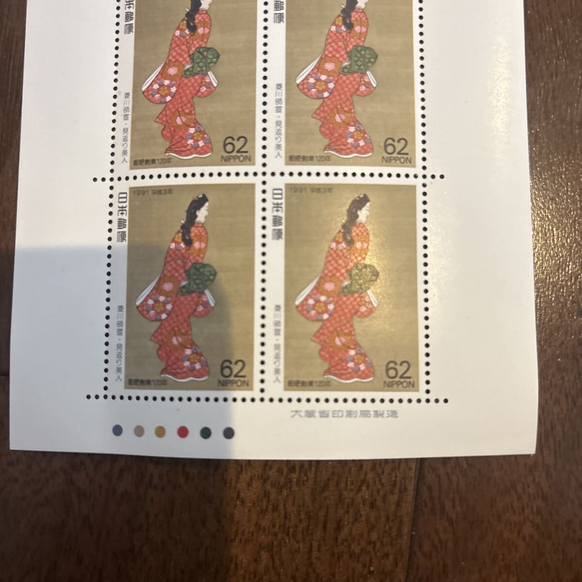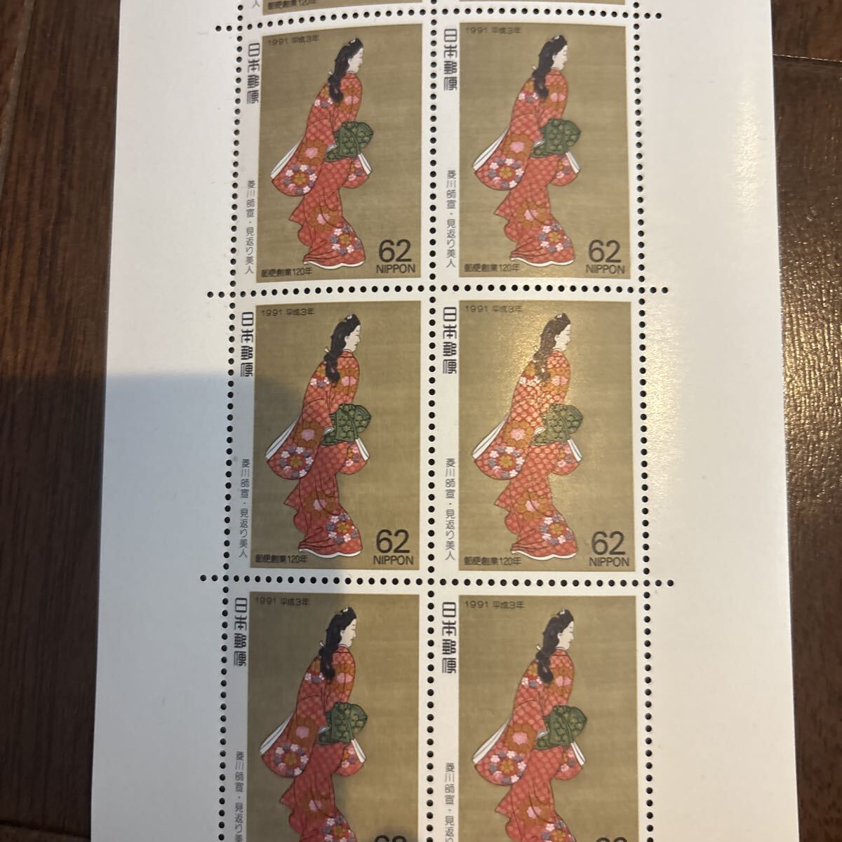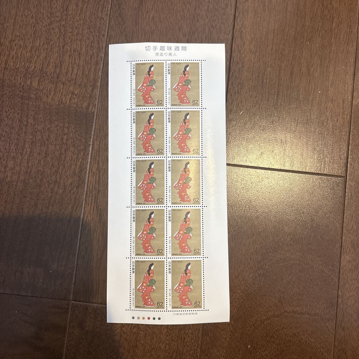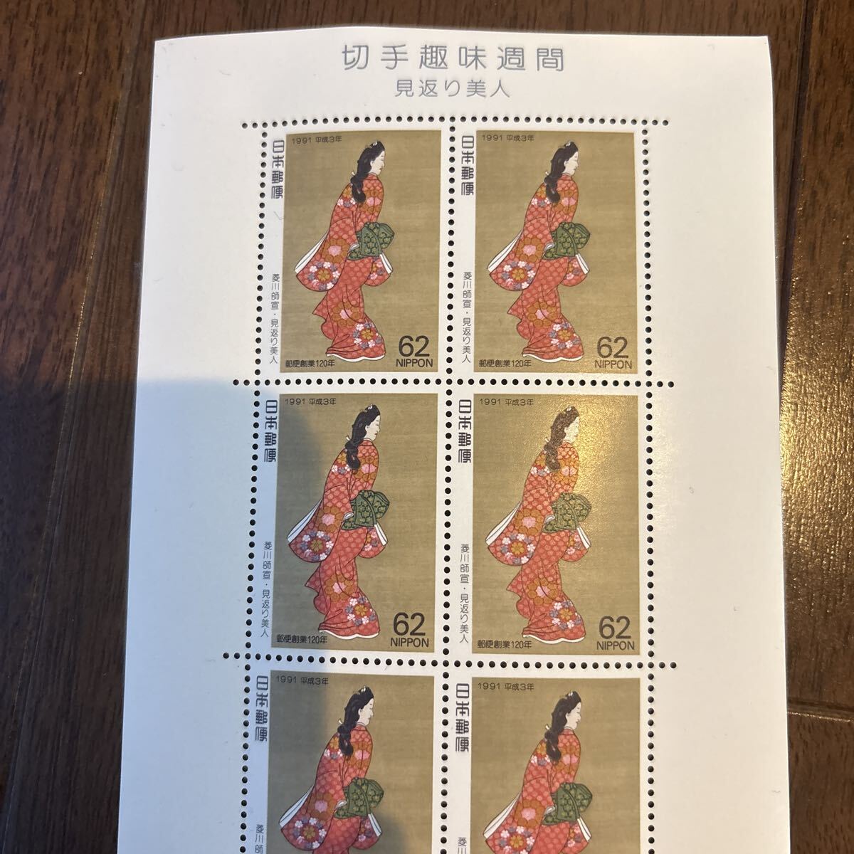 1991年(平成3年)に発行された「切手趣味週間」の記念切手シートです。浮世絵師・菱川師宣の「見返り美人図」をモチーフとしたデザインで、62円切手が10枚、未使用の状態で1シートとなっております。送料は、定形で110円となります。ご心配の方はプラス210円での特定記録でも承ります。送料節約のため、このまま封筒に入れて発送します。郵便事故はこちらでは責任はお受けかねます。業務の都合で、土曜日〜日様日のそれぞれ午前中の発送作業が中心となります。以上をご理解の上、ノークレーム、ノーリターンでお願いします。