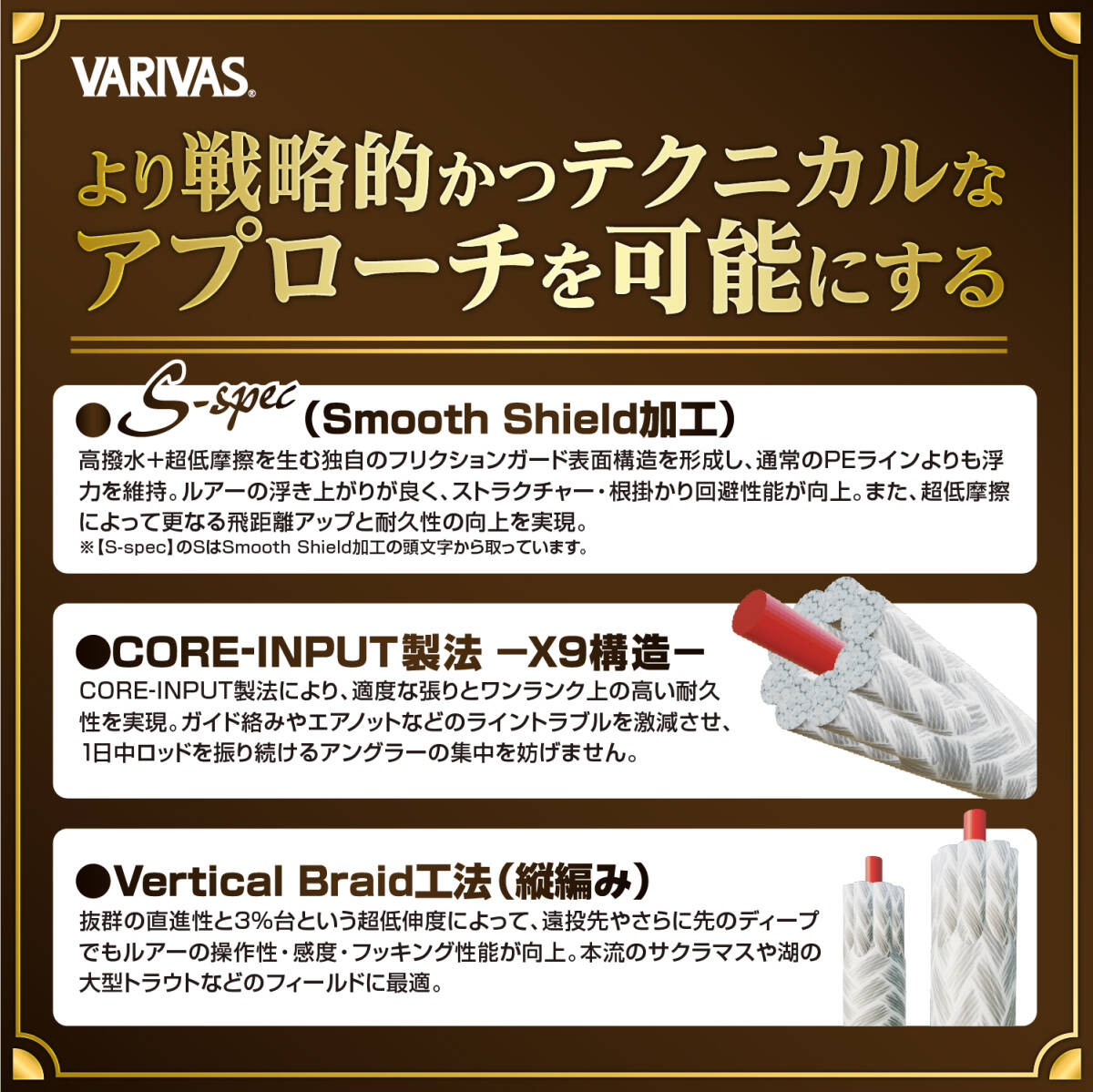 Vertical Braid工法(縦編み)によって抜群の直進性と3%台という超低伸度化に成功。