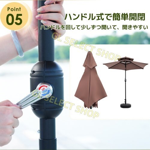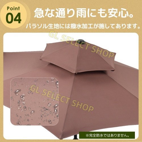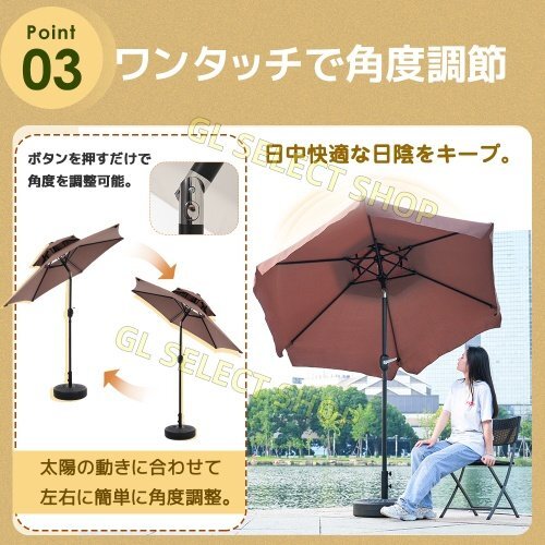 • 【ワンタッチで角度調節 】太陽の動きに合わせて左右に簡単に角度調整。一日中快適な日陰をキープ。パラソル生地には撥水加工が施してあります。急な通り雨にも安心。※完全防水ではありません。