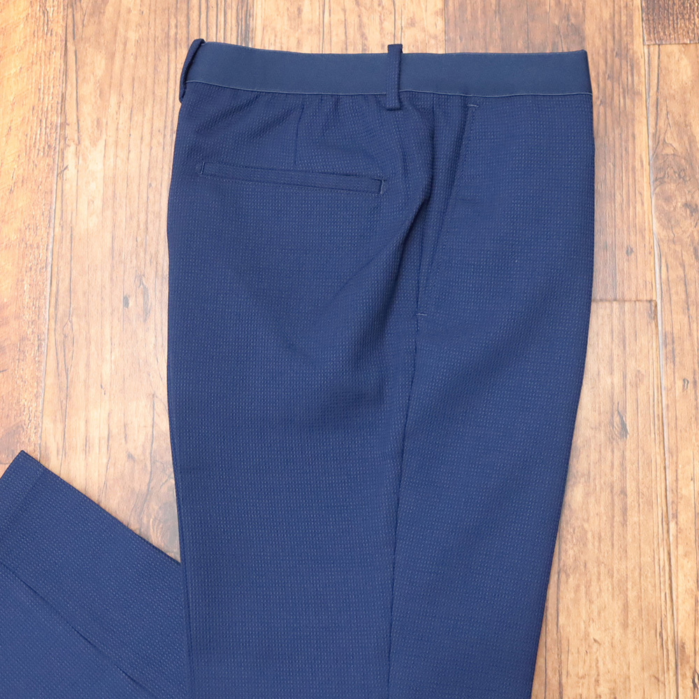 ワッフル組織による立体的で表情豊かな素材感が魅力のスラックス。ウールをベースにポリエステルとポリウレタンをブレンドし、上品な風合いに加えてストレッチ性をプラスしました。程よい伸縮性とウエストゴム仕様により、スマートなシルエットながらリラックスした穿き心地を実現します。