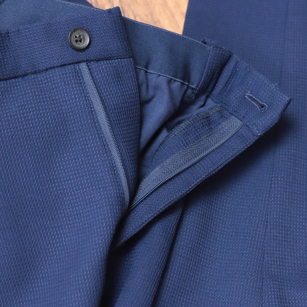 ウエストゴム、ノータック、ジップフライ、膝下まで裏地付き