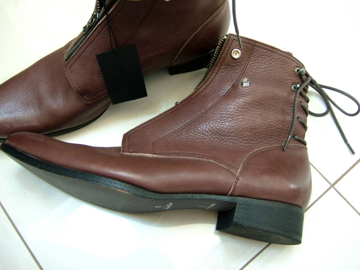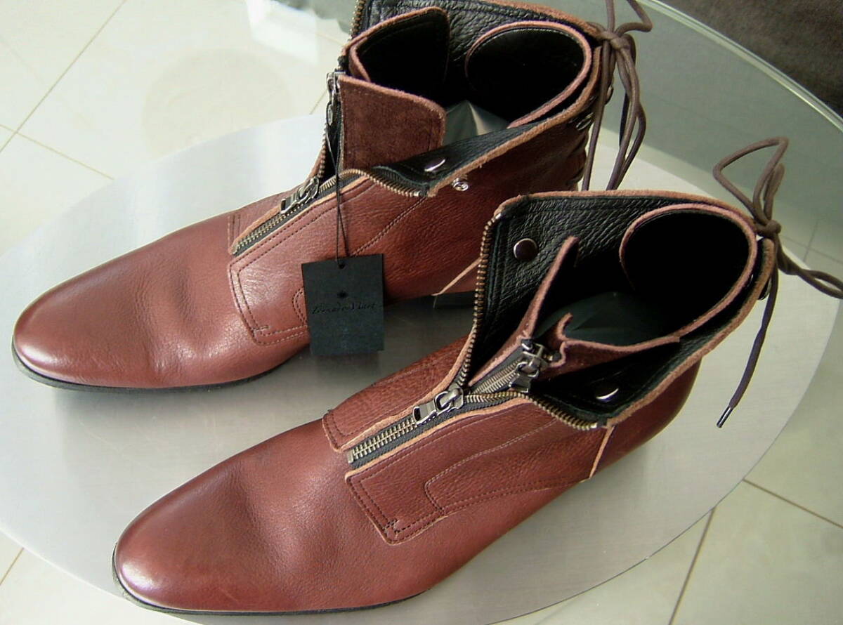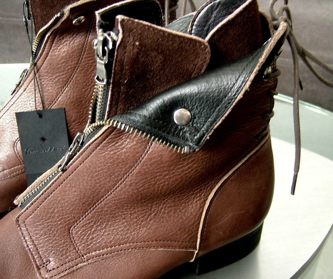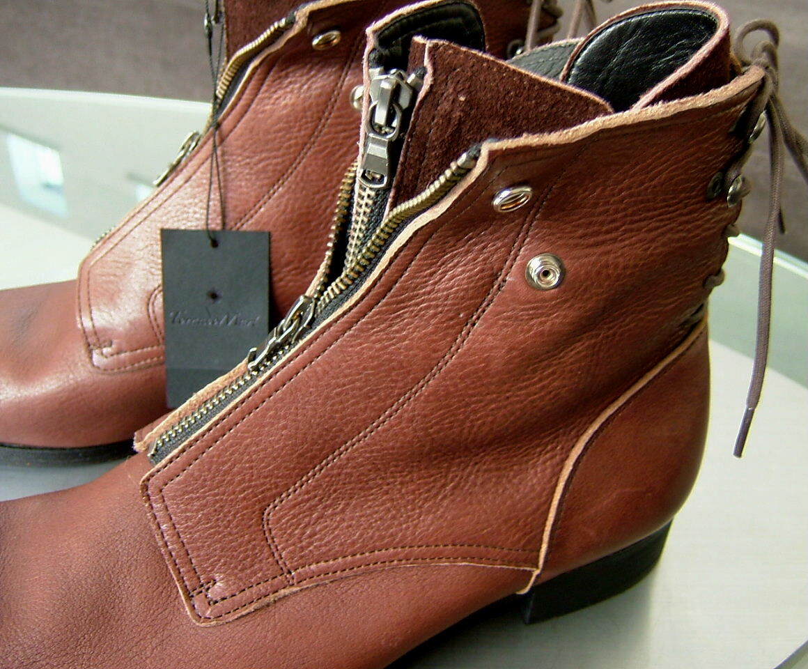 ■レイヤードデザインのZIPアクセントが目を引くオリジナルブーツ フロントのシャープなカッティングに、バックはレースアップでワイルドな仕上り 本体のヌメ革とレイヤード部のベロアコンビネーションが絶妙なアクセントです 履き口を折り返してドット釦で止めたり ZIPの開閉で履き方をお好みでお楽しみいただけます