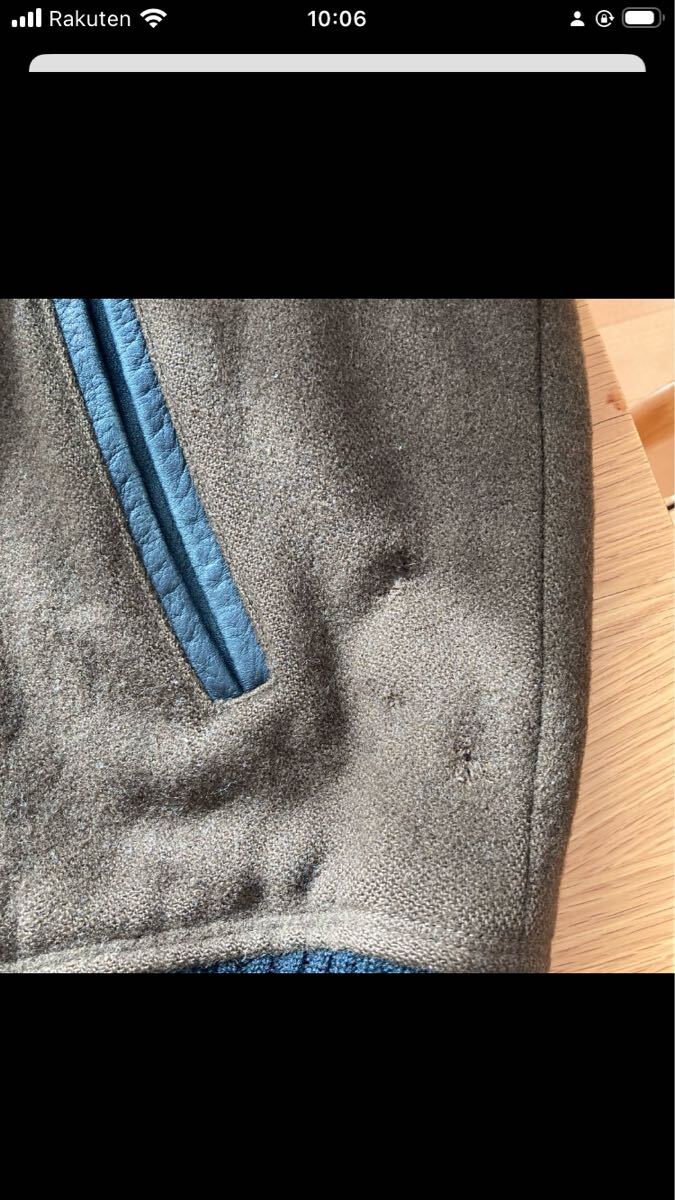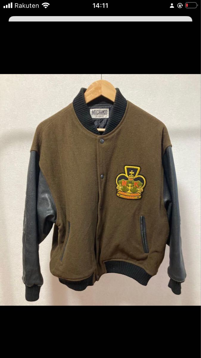 レザー切り替えのスタジャン、刺繍ロゴあり個性的なデザイン 写真の様に傷跡あります