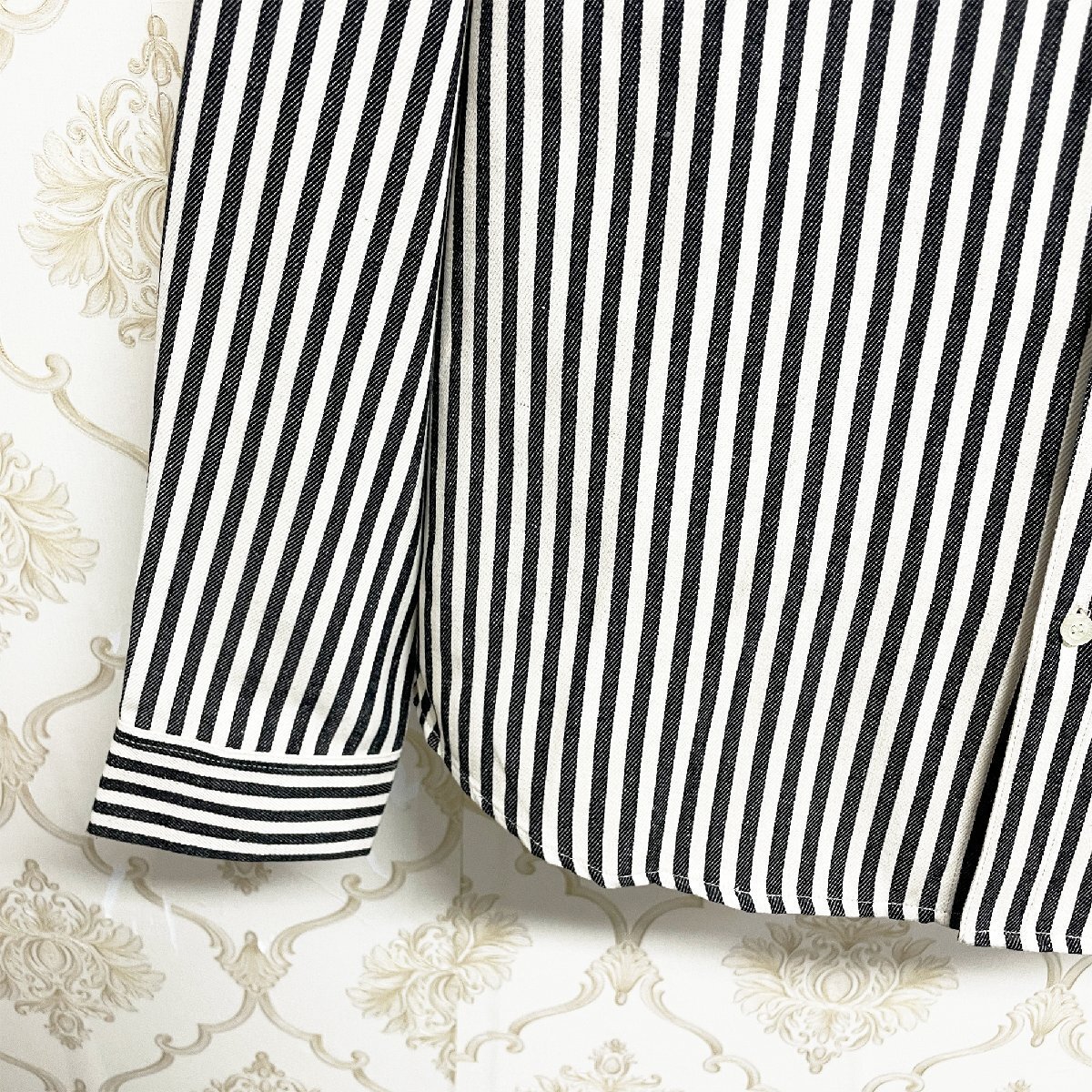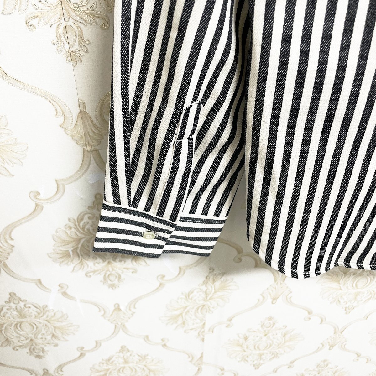 ヴィンテージ感の漂う独特なカラーとストライプ柄が程良い存在感を演出してくれます。ボタンがホワイトで統一されているのが周りと差のつくオシャレに見せるポイント。折り襟と袖口ボタンの仕様により、大人っぽく落ち着いた雰囲気を醸し出します。