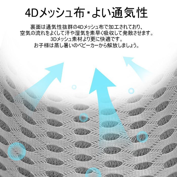 裏面は通気性抜群の4Dメッシュ布で加工されており、空気の流れをよくして汗や湿気を素早く吸収して発散させます。3Dメッシュ素材より更に快適です。お子様は蒸し暑いのベビーカーから解放しましょう。