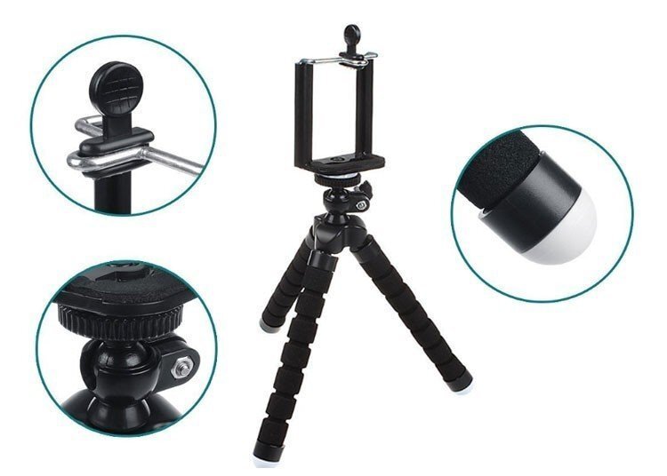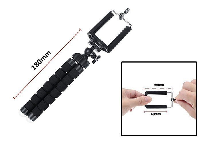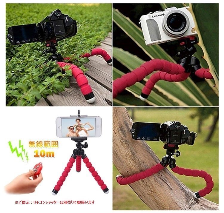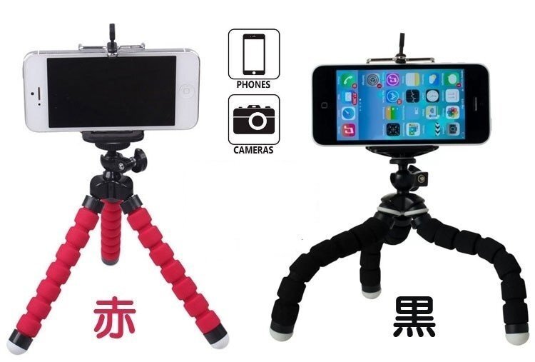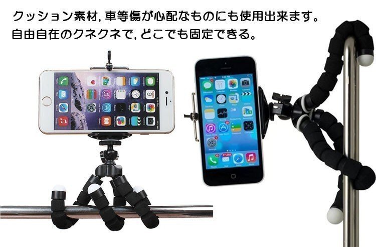 ◆タコ風三脚スタンド スマホホルダー くねくね三脚 GOPRO iPhone用三脚 デジカメ スポーツカメラにも 軽量 小型 様々な角度形状に調整可 自由自在三脚+クリップセット TAKOS200/ブラック