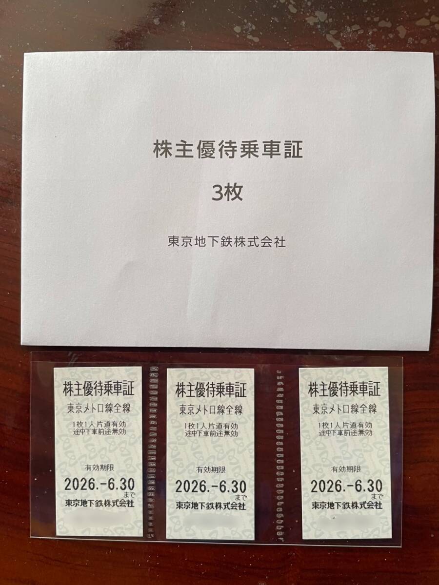 東京地下鉄(東京メトロ)の株主優待乗車証3枚です。
