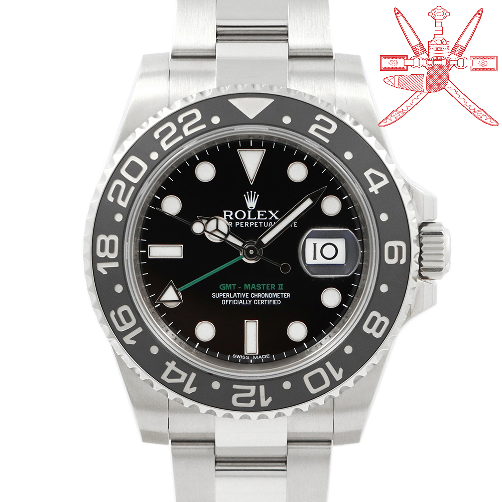こちらはオマーンのKHIMJI RAMDASという正規ディーラーでのみ販売されている、大変希少なGMTマスター2 116710LN Khanjarモデルです。裏蓋に2本のKhanija(短剣)とオマーンのロイヤルエンブレムである王冠が刻印されています。搭載されているムーブメントCal.3186は、衝撃と温度変化に対して優れた耐久性を発揮するパラクロム・ヘアスプリングを装備し、並外れた信頼性を実現しています。スタイリッシュなデザインでビジネスシーンでも、プライベートシーンでも活躍してくれる事は間違いない魅力的な逸品です。