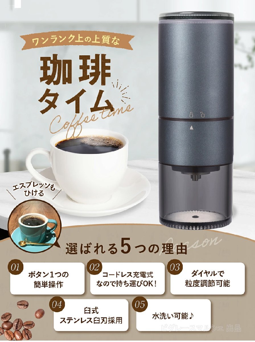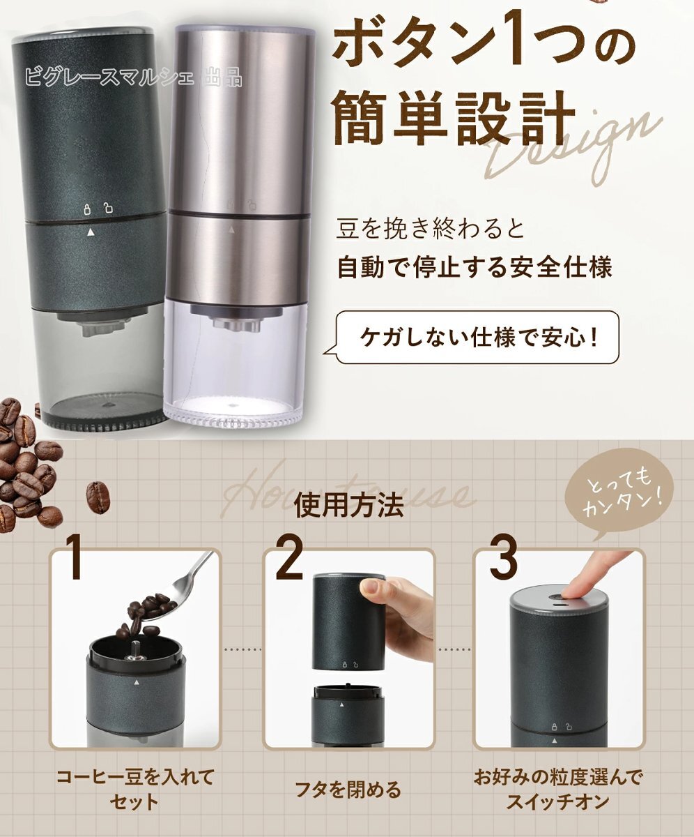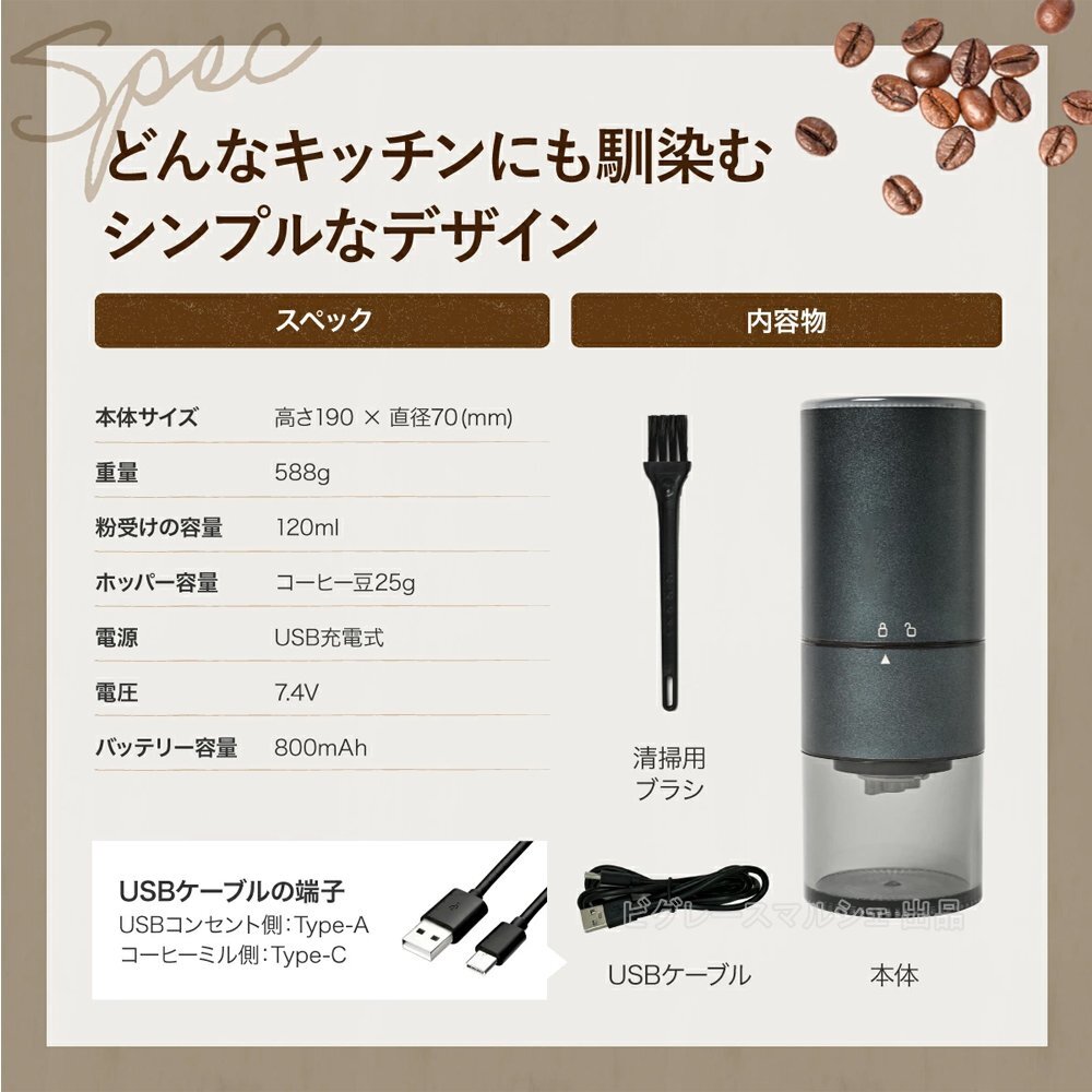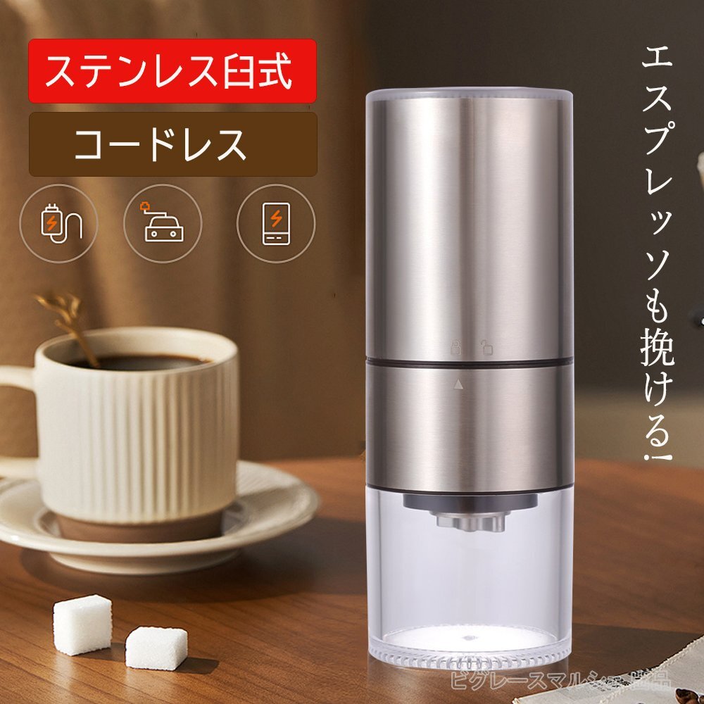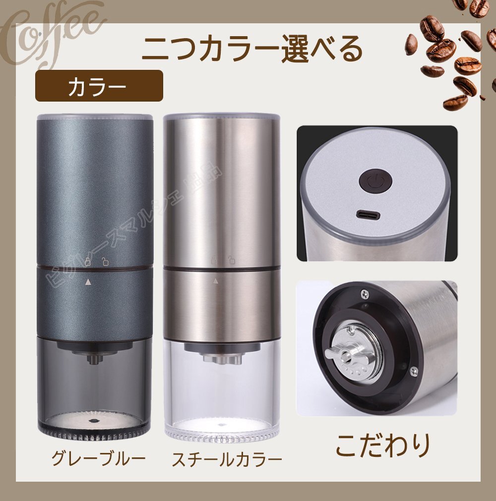 電動コーヒーミル ステンレス 臼式 コニカル式 USB 充電式 コーヒー 電動ミル 珈琲ミル 小型 コンパクト スチールカラー