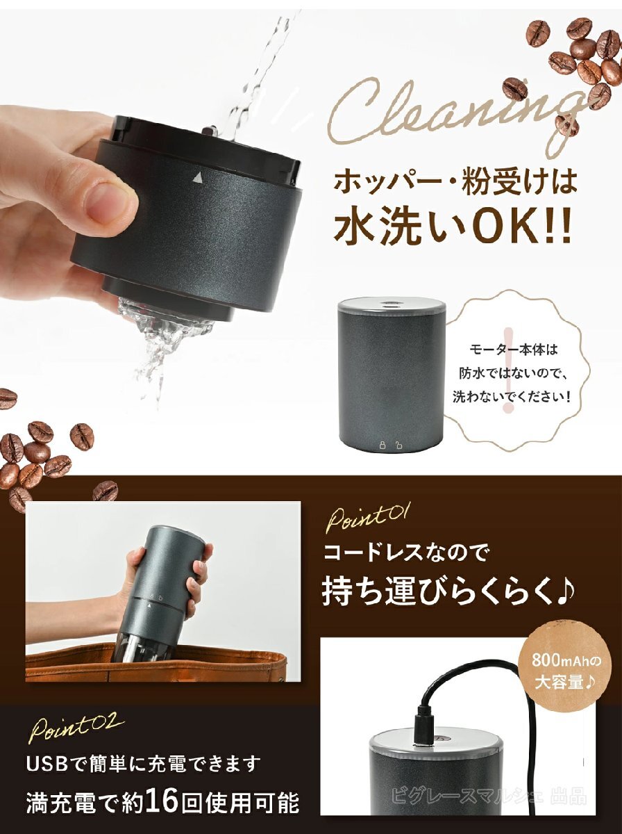 USB充電式のコードレス電動コーヒーミルなので持ち運びも楽々。