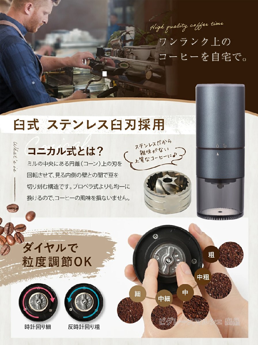 電動コーヒーミル ステンレス 臼式 コニカル式 USB 充電式 コーヒー 電動ミル 珈琲ミル 小型 コンパクト スチールカラー hw1235