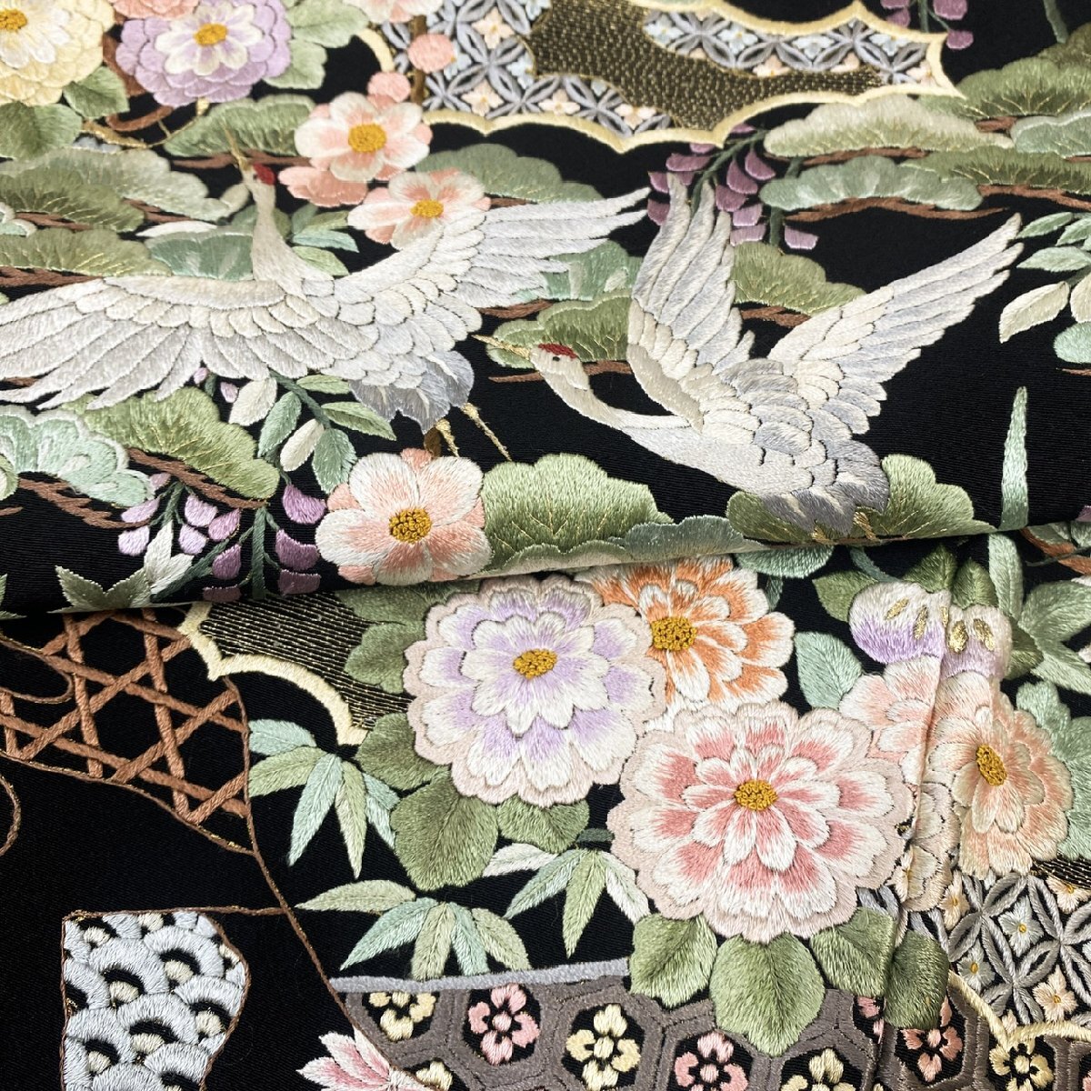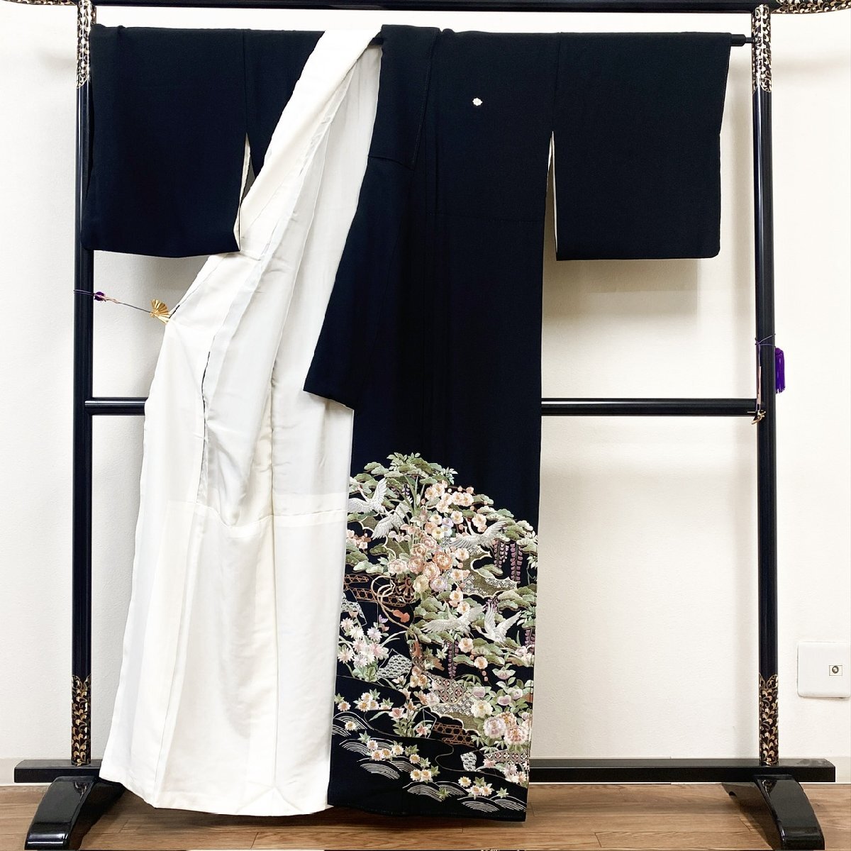 着物月花 麗光刺繍 相良刺繍 蘇州刺繍 花鳥文様 黒留袖 正絹 金糸 共八掛 ki7041