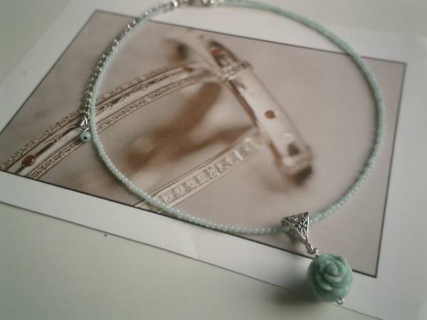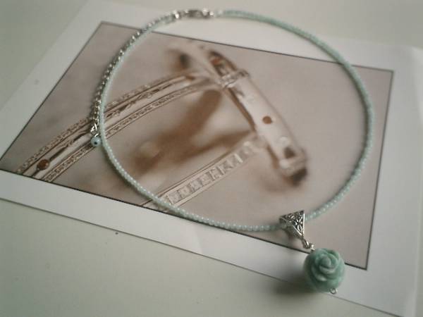仏蘭西物語・・シリーズです♪ミッシェルの水色・・可憐なアマゾナイトのネックレスです♪極小のアマゾナイトの丸玉に翡翠の薔薇を合わせて儚げな表情です♪トップは外せますのでシンプルなデザインでも楽しんでいただけます♪2ミリ位の丸玉のアマゾナイトには14ミリの翡翠の薔薇を合わせました♪長さは42センチ+アジャスター13センチで最長55センチ位です♪お揃いのネックレスやブレスレットも出品しています♪♪シンプルで飽きのこないいつまでも着けられるデザインを考えて作りました!ハンドメイドをご理解頂いてノークレーム、ノーリターンでお願いします