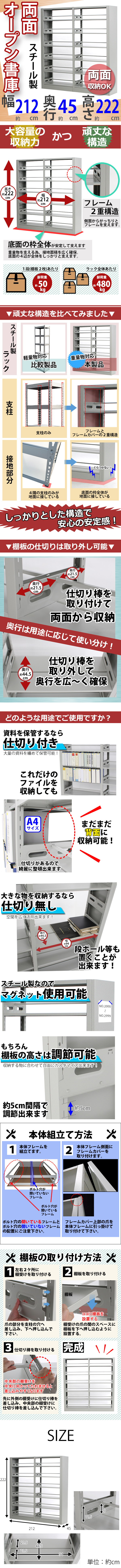 | 商品紹介 | ◇◇スチール製 両面オープン書庫◇◇ ◇頑丈なスチール製の両面オープン書庫です。 ◇資料を大量に保管出来るので仕事場でも大活躍! ◇フレーム2重構造でしっかりとした安定感。 ◇底面枠全体が接地するのでぐらつきません。 ◇錆びにくいのでお手入れも簡単です。 ◇素材:スチール ◇耐荷重:約25kg /(棚板1枚) 約480kg /(ラック全体) ◇重量:約103kg ※こちらの商品は、組立て式です。 (プラスドライバーとスパナ(10mm、12mm、14mm)をご用意下さい。) |