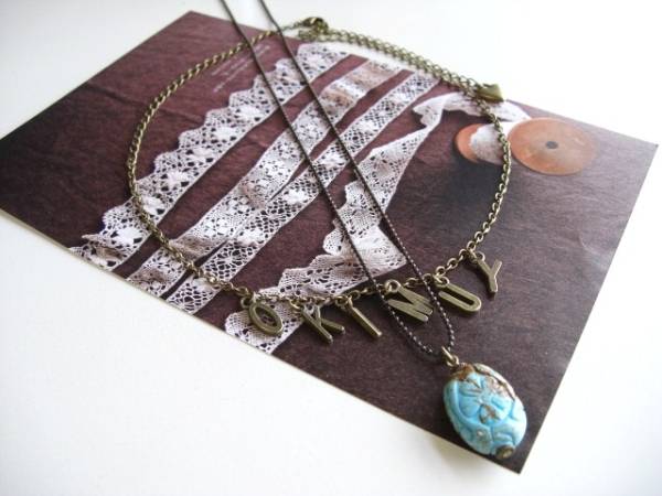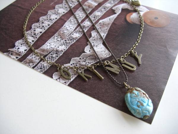 初夏のクローゼット・・シリーズです♪ダージリンの香り・・シックな英字モチーフとマグネサイトターコイズのネックレス2点セットです♪アルファベットのモチーフと爽やかなターコイズ色のマグネサイトがキュートな表情です♪英字モチーフは14×7ミリ位です♪長さは全長60センチ位で調節自由です♪お花彫りのマグネサイトは25×15ミリ位です♪長さは72センチ+アジャスター10センチで最長82センチ位です♪単品やブレスレットも出品しています♪シンプルで長く着けていただけるデザインを考えて作りました!ハンドメイドをご理解頂いてノークレーム、ノーリターンでお願いします