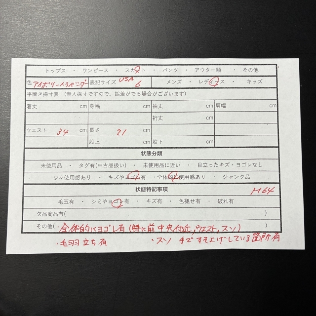 ・全体的にヨゴレ有(特に前中央付近・ウエスト・スソ)