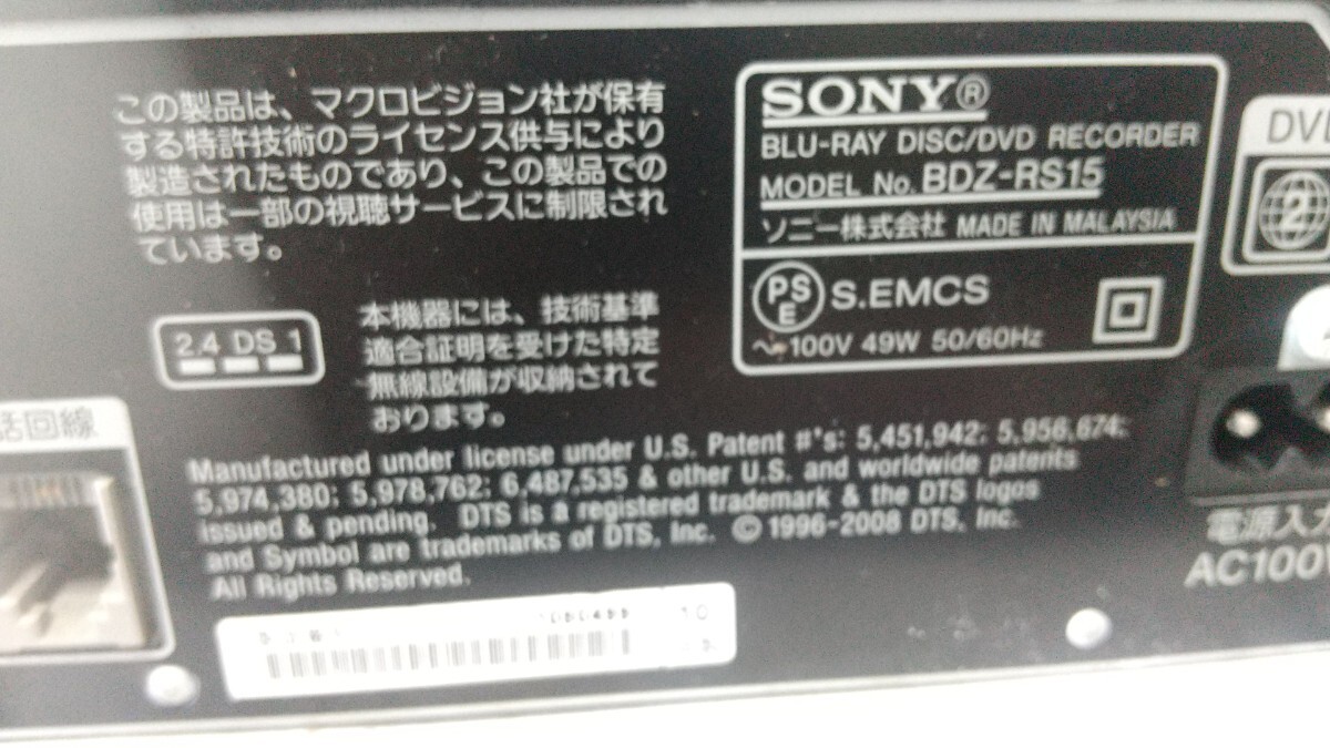 K3539 SONY BDZ-RS15 2010年製 ブルーレイレコーダー/ソニー/ 通電OK その他不具合あり 現状品 JUNK