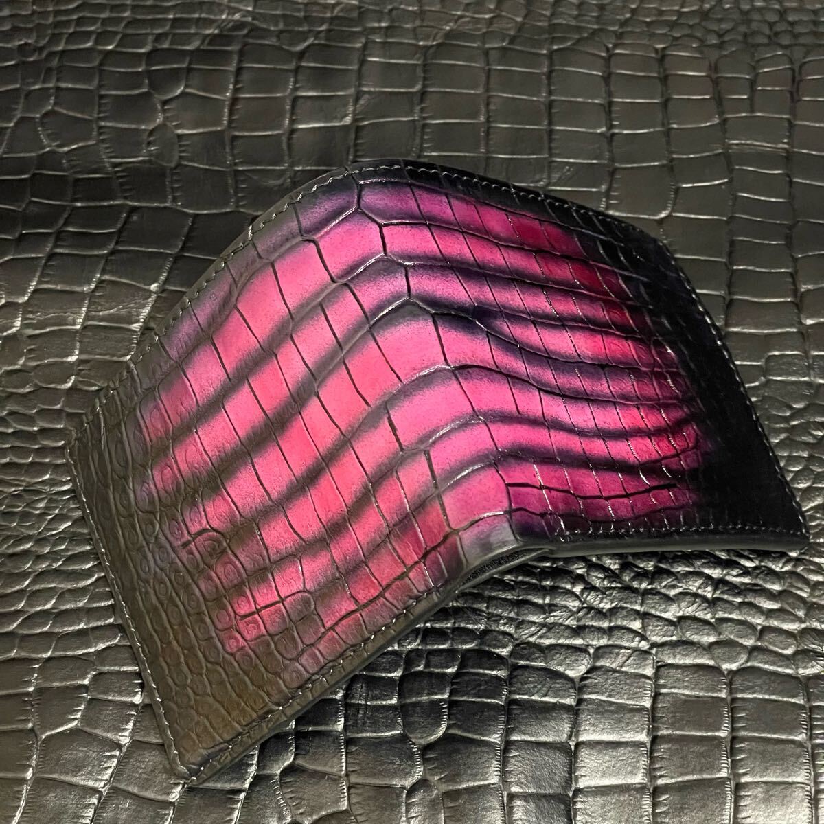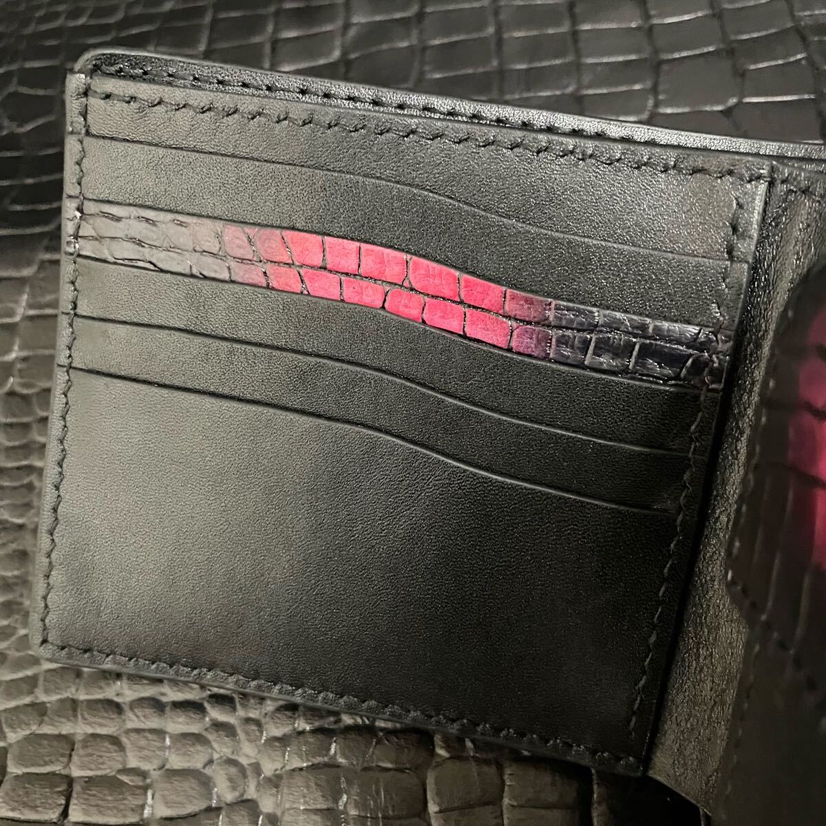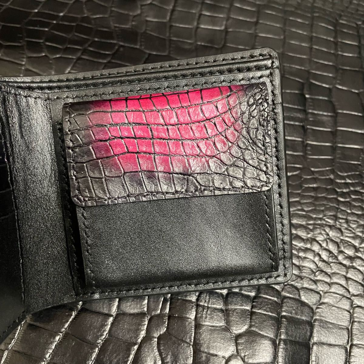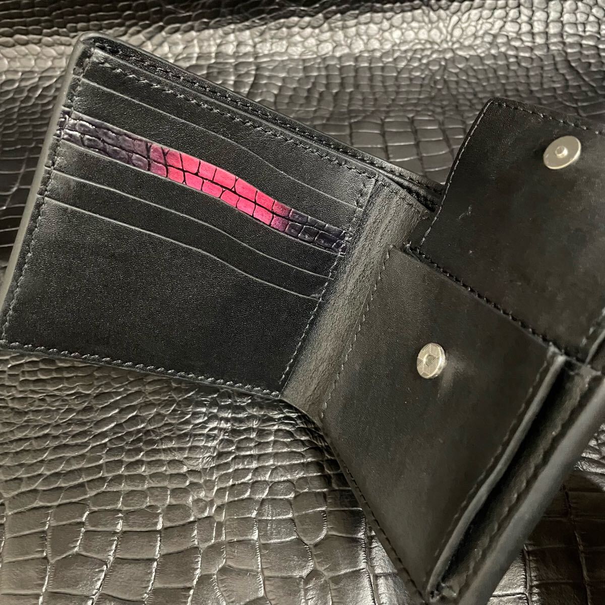 小銭入れの蓋の部分とカード入れの一部をクロコダイル使用でワンポイントアクセントにしており、他に見ないカッコいいデザインです。コイン入れ開閉はマグネットタイプになっております。
