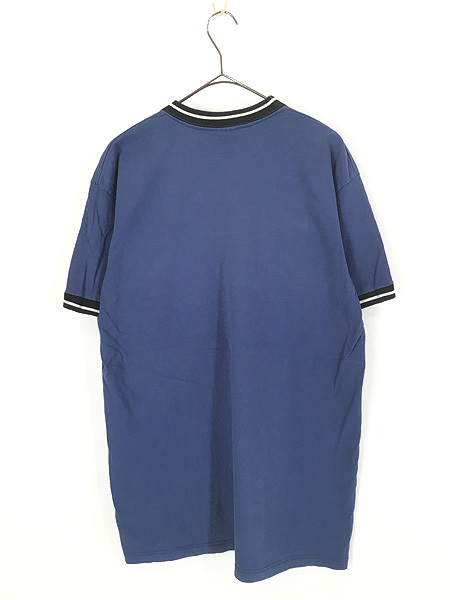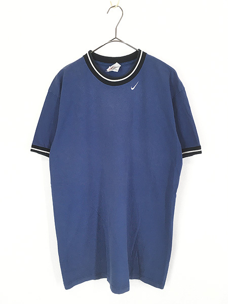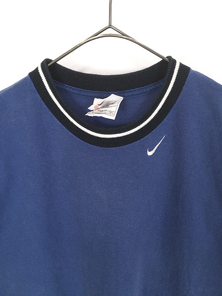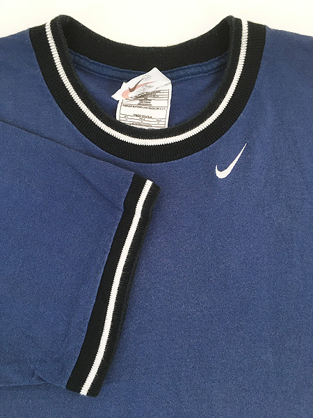 首元にスウォッシュ刺しゅう、ラインの入ったリンガーT。