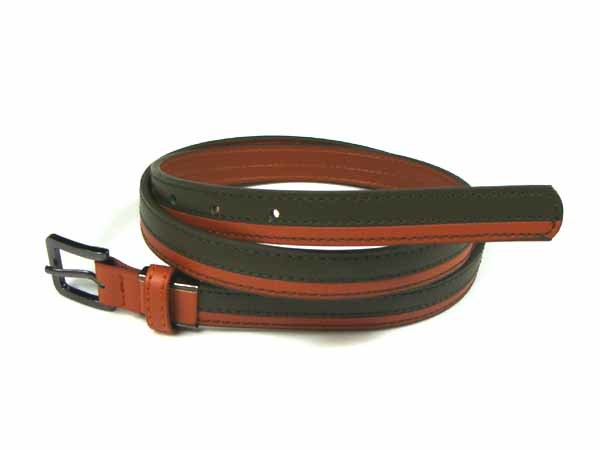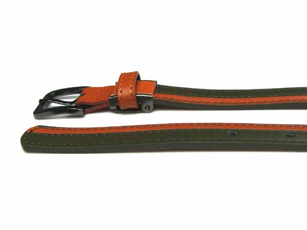 ピンバックル使用のカーキグリーン×オレンジキャメルカラーの2トーンカラー牛革使用スリムベルト