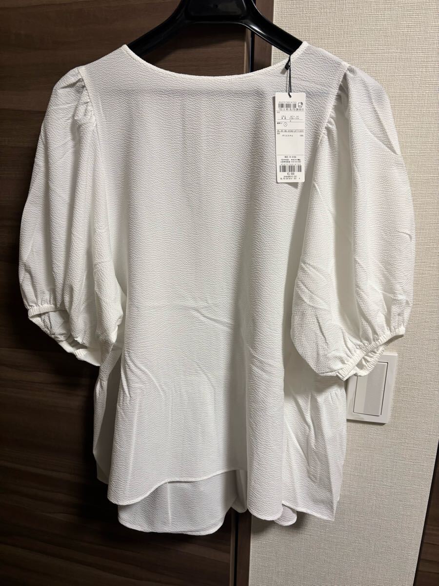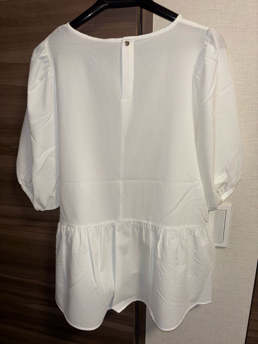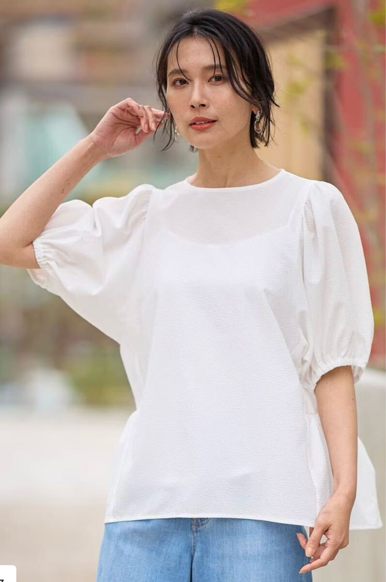 パフスリーブとフレア裾が特徴のホワイトブラウス。