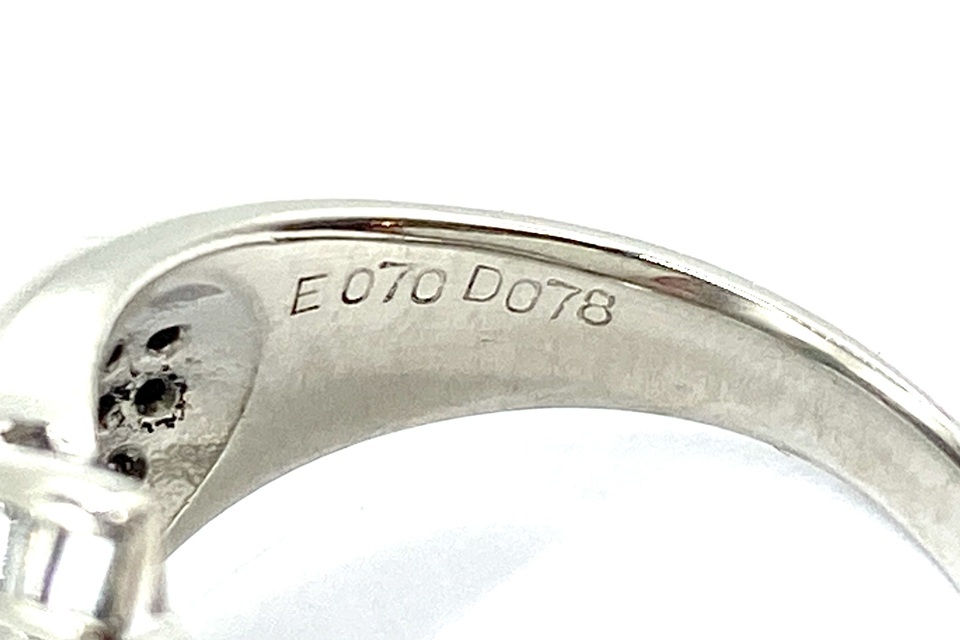 | 仕様 | E=0.70ct 主石サイズ5.3×4.7mm D=0.78ct ♯14号 最大幅14.5mm 12.5g |