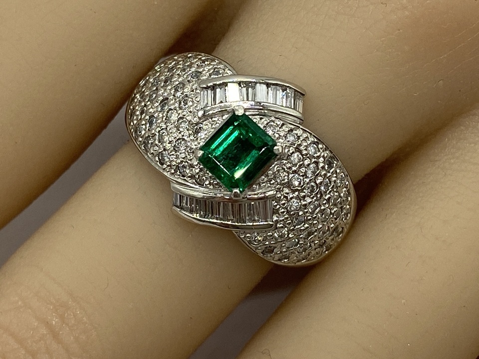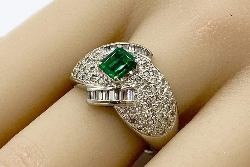 | 解説 | 細やかなダイヤの煌めきの中、ひと際鮮やかなグリーンの輝きが目を惹きます。内包物の多さはエメラルドの宿命ですが、こちらはテーブル面から観察すると、比較的クリーンな印象。つい眺め入ってしまう深淵なる輝きに、癒されてください・・・。 |