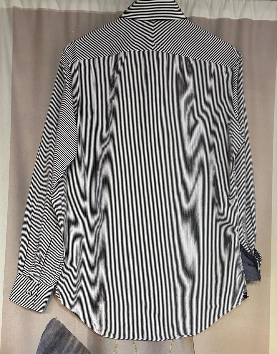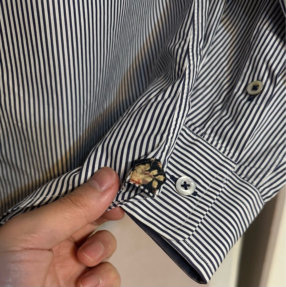 ・上質なコットンで仕立てられたストライプ柄に花柄のガゼットがお洒落で着心地の良いドレスシャツとなります。
