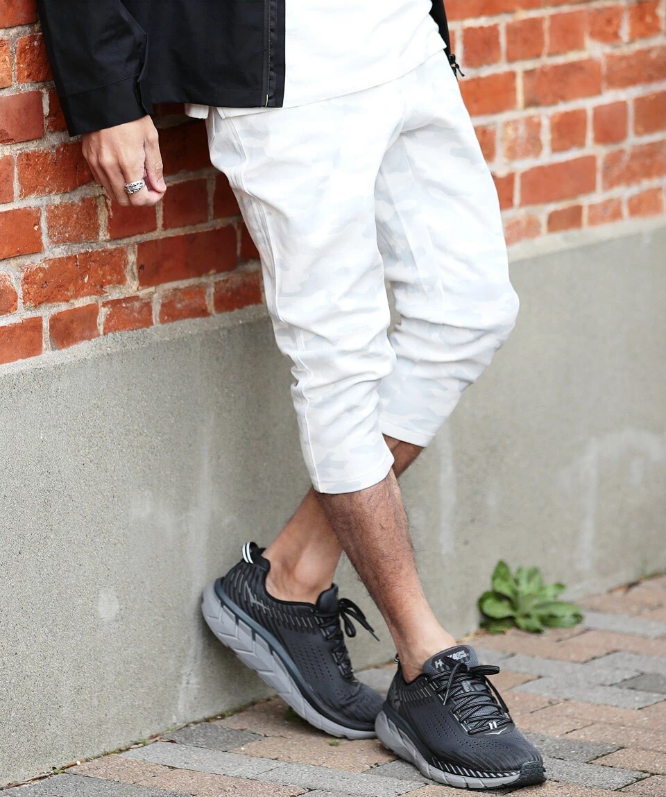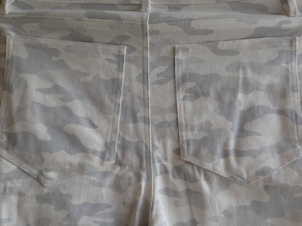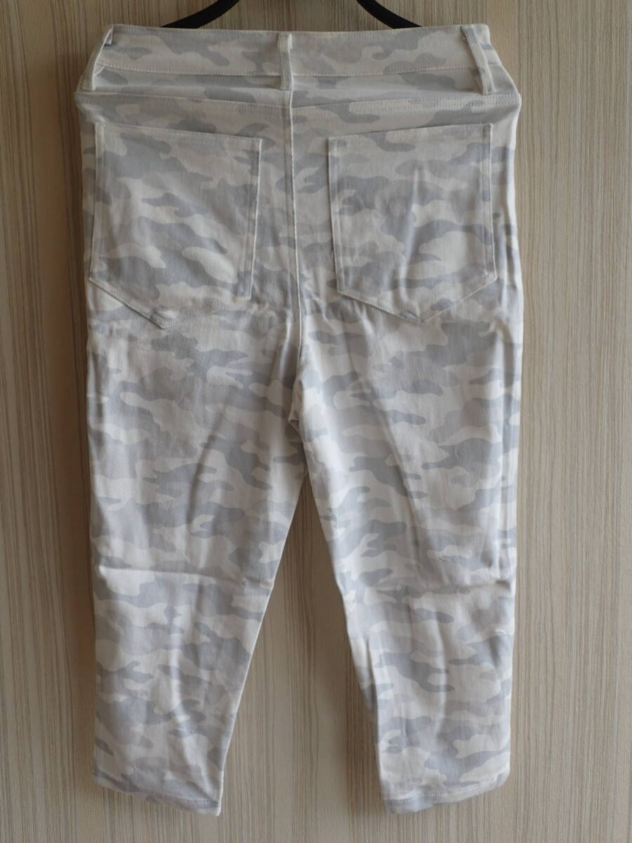 カモフラージュ柄のホワイトクロップドパンツスタイリッシュなデザイン