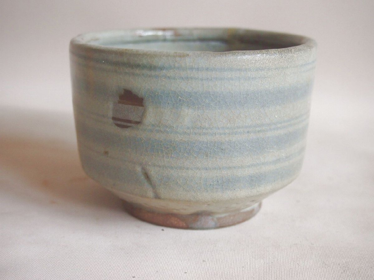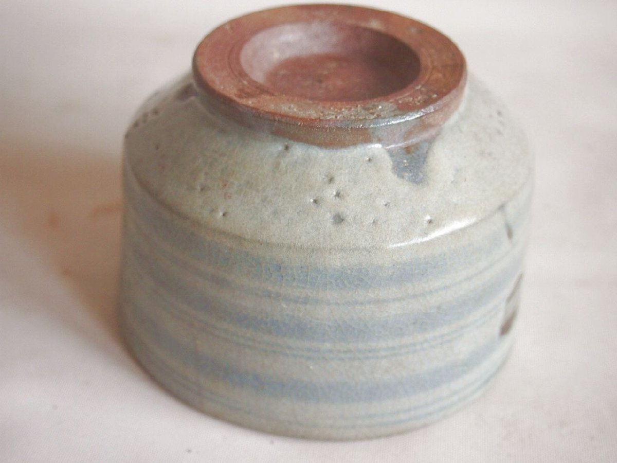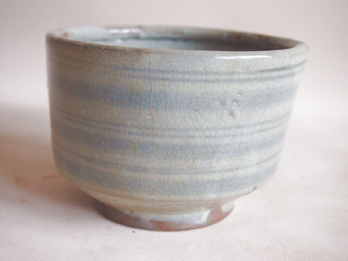 珍しい江戸時代(江戸初期) 木原窯 染付輪線文火入れ11cmです。 古伊万里から 唐津焼へ過渡期の 両者の味わいを兼ね備えた 歴史的にも 興味深い作品で 古伊万里の 赤絵でも稀に見られる 横に線が複数入った 珍しいデザインで モダンでシンプルな意匠は 現代アートにも引けを取りません。 偶発的に生じた胴の釉切れの 丸い部分の土見せが この器の面白味と、 個性を与えています。 古雅な雰囲気を持っており 火入れとしてではなく 剣山を仕込んで花器として も活けた草花を引き立ててくれます★ 敷布も付属します。 木原窯は 変形や傷物、 残欠が多いですが そんな中、口縁から側面に 細いタチ、 窯傷の直しがある程度と 状態も良好です。 古い品ですので 画像もご確認の上 ご検討ください。 ※茶筅(高さ12cm)は サイズ確認のサンプルです。 ★サイズ(約寸) 直径11cm 高さ7.5cm 高台6.5cm 重量346gほど 付属品 敷布 素敵なひと時を♪ |