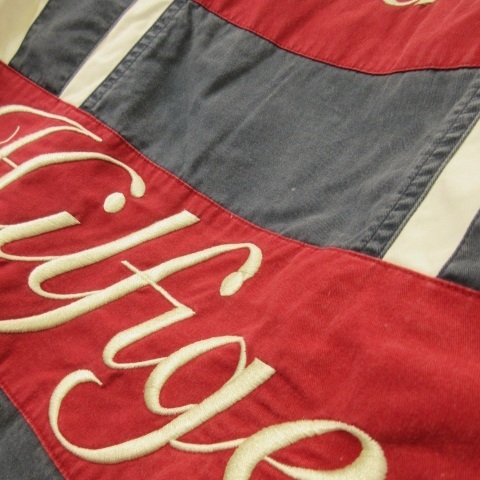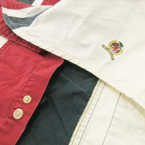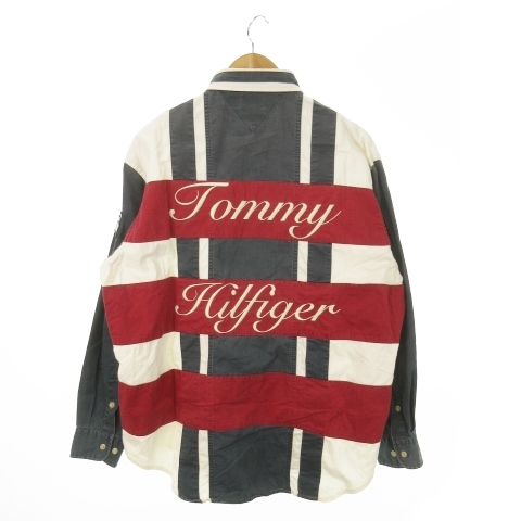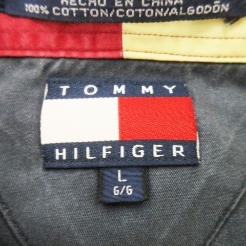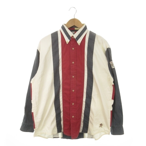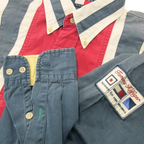 トミーヒルフィガー TOMMY HILFIGER ボタンダウンシャツ 長袖 コットン ヴィンテージ加工 切替 バック刺繍 ロゴ L 白 紺 赤
