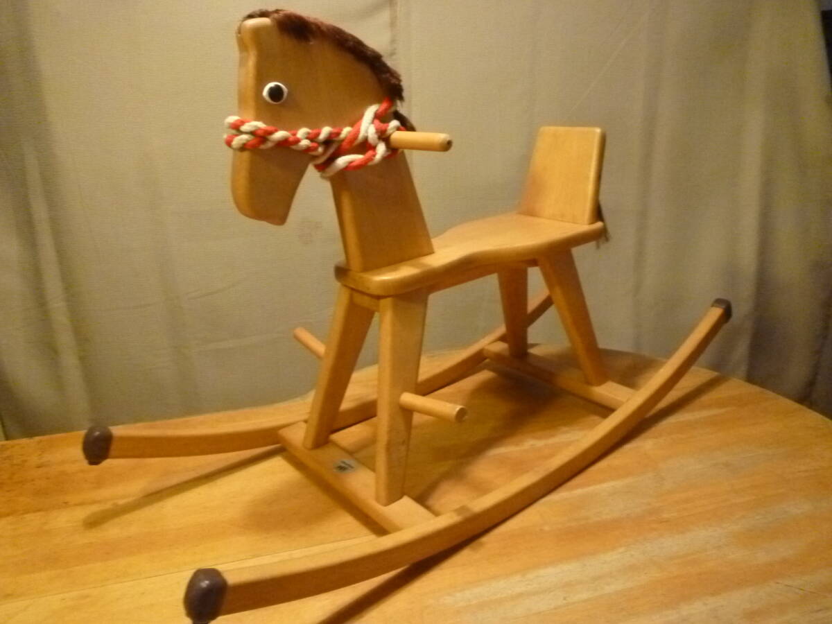 こちらは小さなお子様用に底横板に西ドイツ製のシールがある木馬です。全体は細身ですがしっかりとした造りの様で、弓型ベースの曲がりが大きく前後の揺れ幅も大きなタイプの様で、ベースの前後にはひずめの様なツメ付きのストッパーが付いていて、目もパッチリとインテリアとしても素敵だと思います。