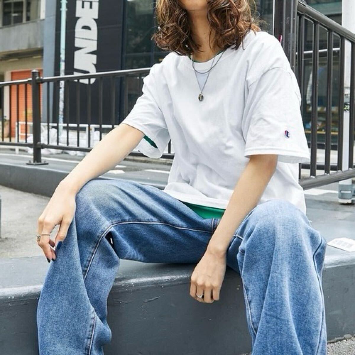 ・無地Tの中に左袖にワンポイントで施したチャンピオンのロゴワッペンが良いアクセントに