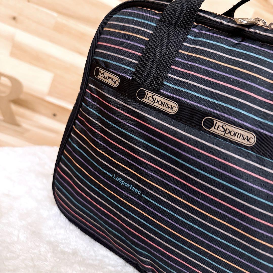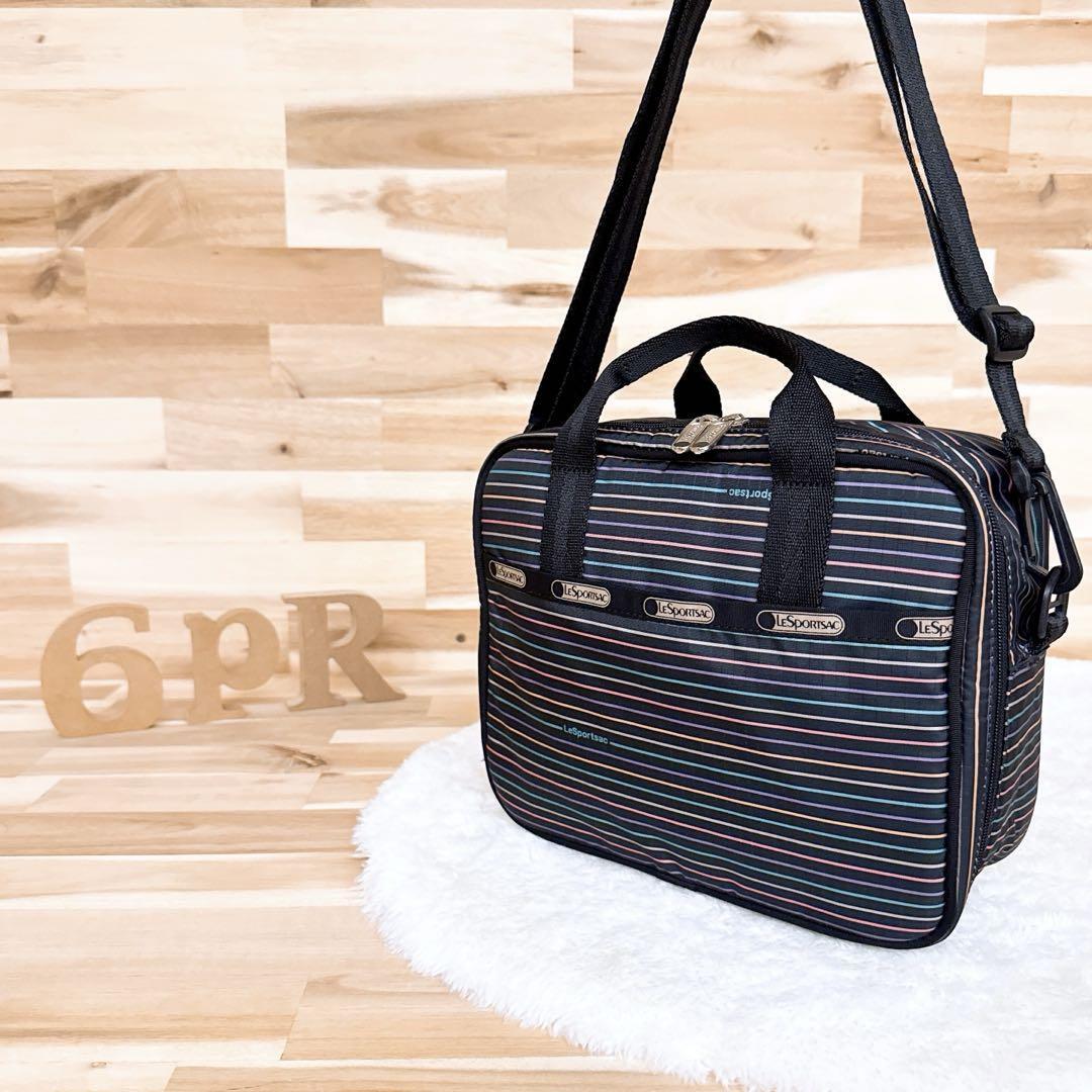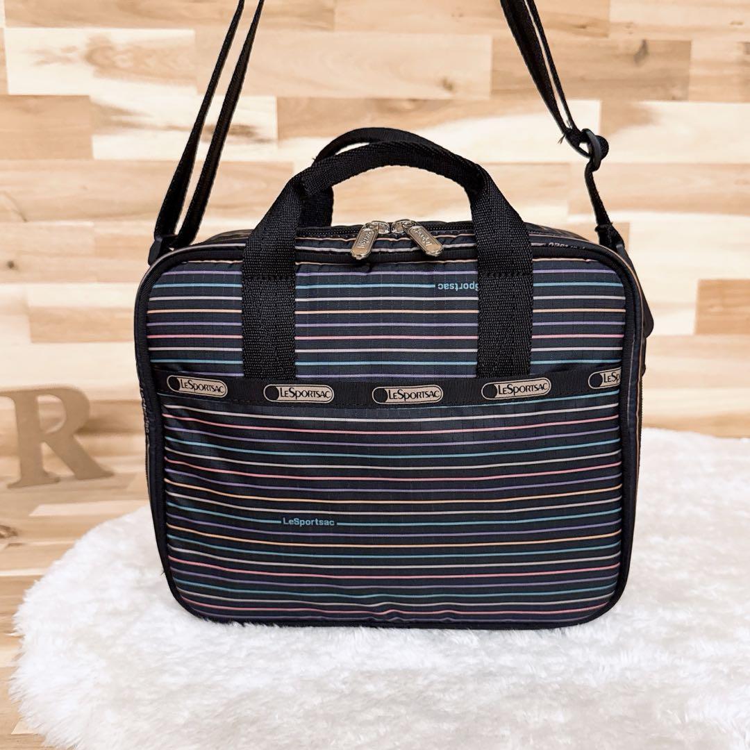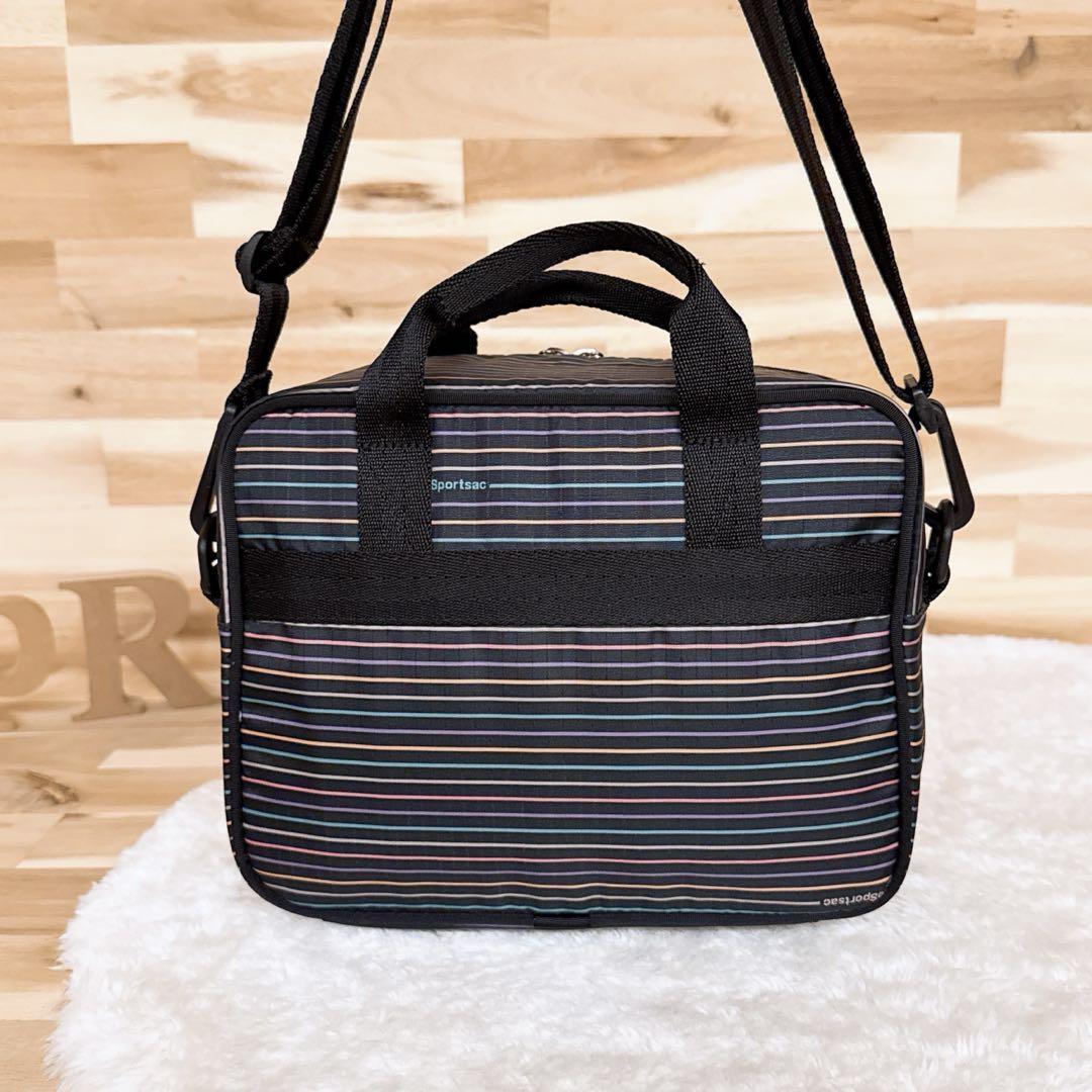 * ストライプ / ランチバッグ *マットなブラックベースに、繊細なマルチストライプ(ボーダー)が走るシンプルなデザイン。様々なカラーがライン状に配され、控えめながらも洗練された雰囲気に。スクエアフォルムの安定感とフロントポケットの機能性、保温、保冷機構がデイリーに嬉しいポイント。シックな装いからカジュアルまで幅広く馴染み、通学、ビジネス通勤スタイルにも合わせやすいLeSportsacのショルダーバッグです。