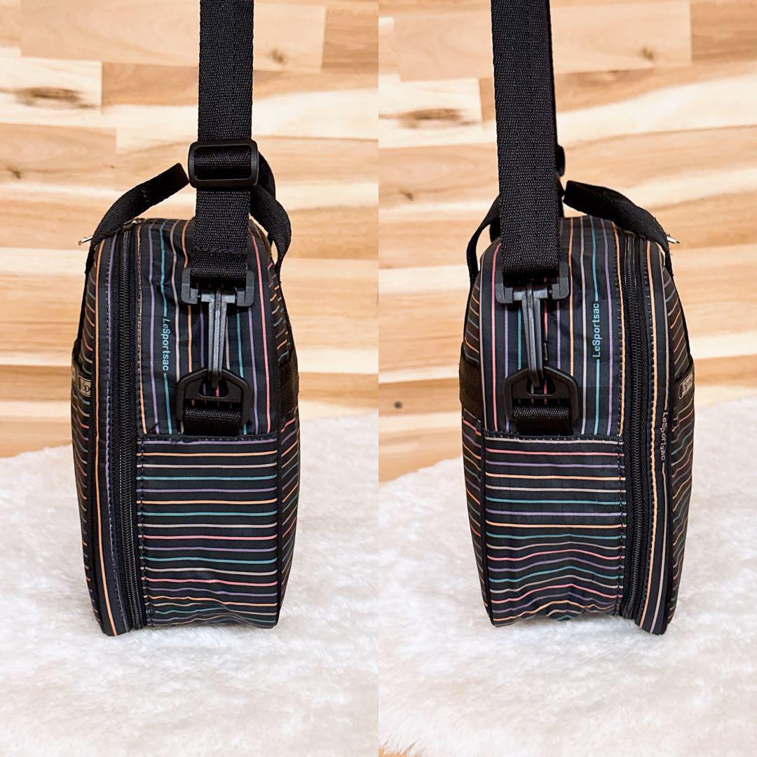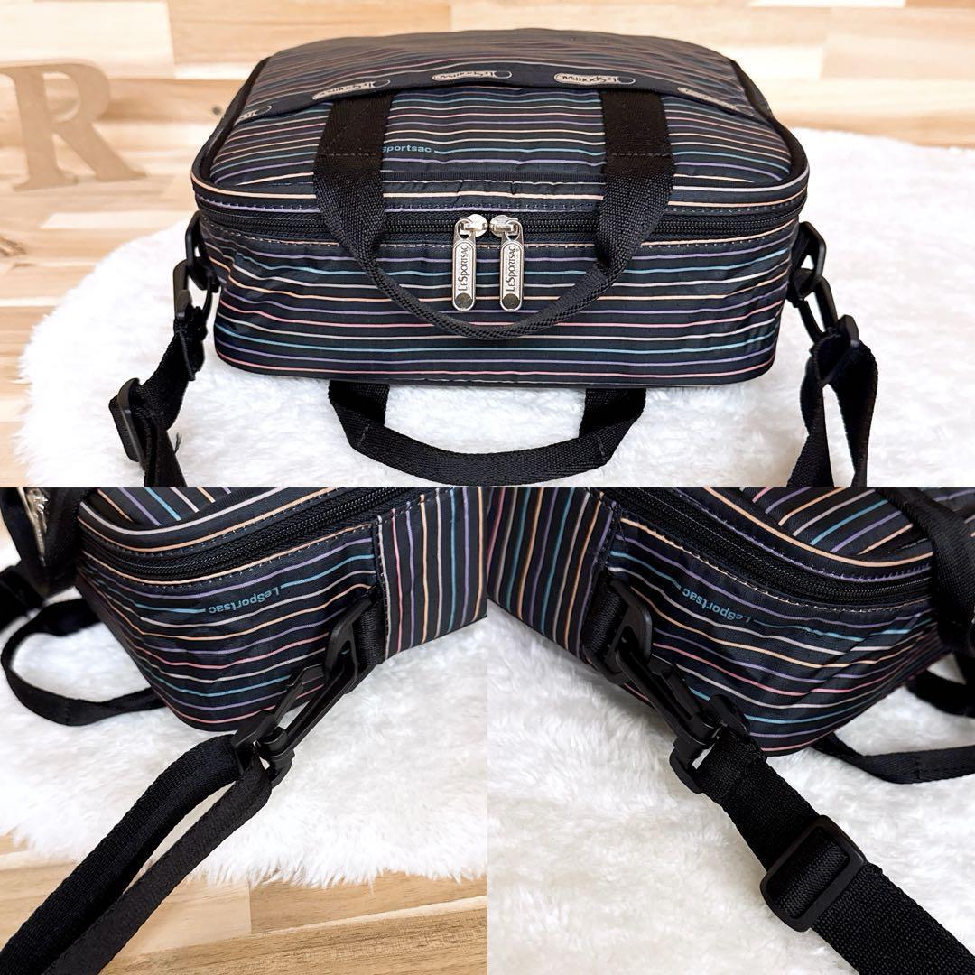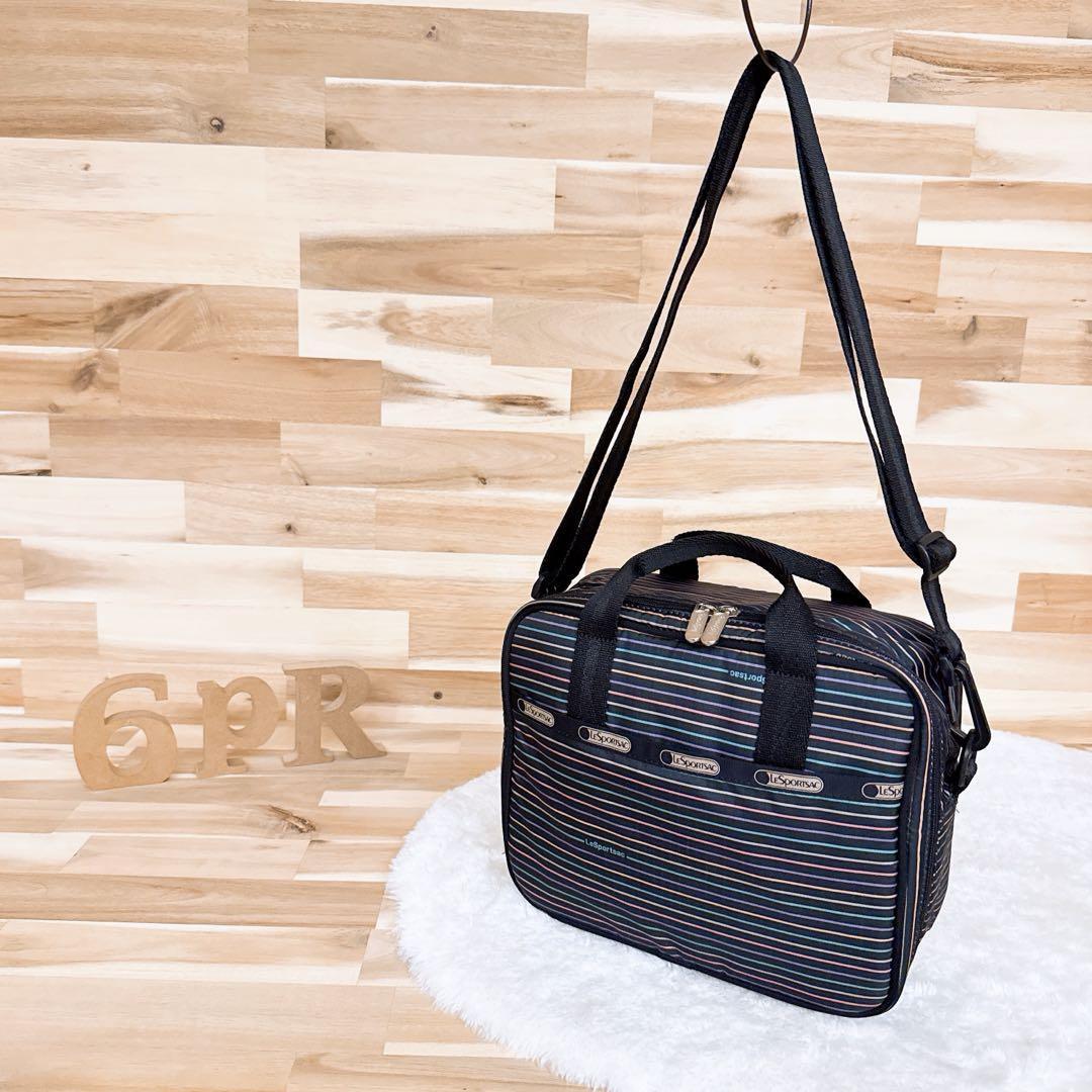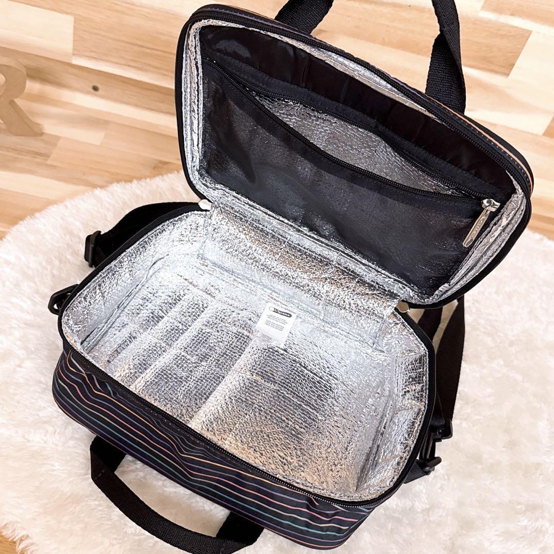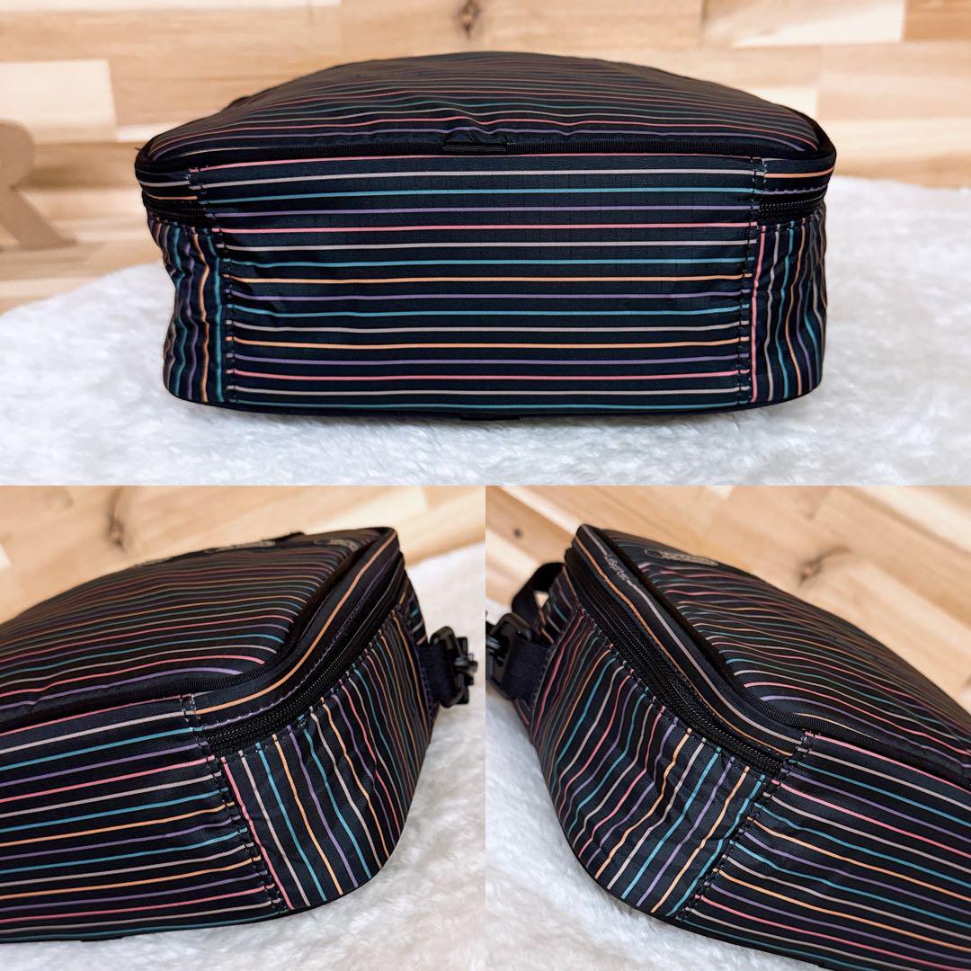 * ストライプ / ランチバッグ *マットなブラックベースに、繊細なマルチストライプ(ボーダー)が走るシンプルなデザイン。様々なカラーがライン状に配され、控えめながらも洗練された雰囲気に。スクエアフォルムの安定感とフロントポケットの機能性、保温、保冷機構がデイリーに嬉しいポイント。シックな装いからカジュアルまで幅広く馴染み、通学、ビジネス通勤スタイルにも合わせやすいLeSportsacのショルダーバッグです。