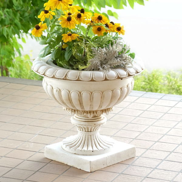 陶磁器などの原料になる 長石などの粉末”石粉”と”石膏”を混ぜて作った 風格と重厚感のあるガーデンアイテム まるで本物のアンティークのように ディティールまでこだわったデザインが魅力です その存在感は ヨーロピアンな風を運んでくれそうで 丹精込めたガーデンに 華やかで優雅な空間を演出してくれます 丸みのあるラインで構成された 優しい雰囲気のプランター 中間部に立体的に施された リーフオーナメントデザインが凝っていて バードバスや水生植物のプランターとしても使えそう 同シリーズのプランターや コラムを並べてアレンジしても◎ 商品名 : ガーデンプランター B 商品番号 : ebn6524 全体のサイズ(cm) : 幅42×奥行42×高さ40 プランター内寸 : 幅33×奥行33×深さ18 材質 : 石粉 重量 : 5kg 生産国 : 中国 ※材質の特性上、細かい石粉がこぼれやすくなっております。また、穴、ヒビ、欠け、傾き、凹凸や、がたつき、ペイントムラ等は製造方法によって出来るものであり、それを敢えて活かしたアンティーク風デザインの商品です。特性を予めご理解いただいた上でのご検討をお願いいたします ※直射日光や風雨によるダメージは避けられません |