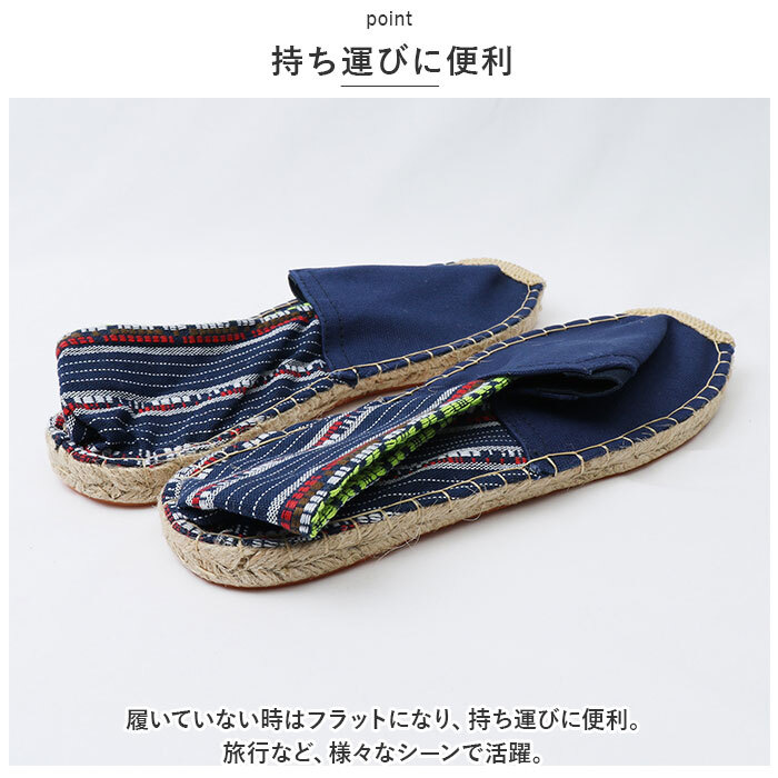 | 商品説明 | ・・素足で履くと気持ちいい!リネン素材のシューズが発売。 ・【快適な履き心地】 ・通気性が良くサラっとした麻素材で、長時間履いてもムレにくく快適な履き心地◎ ・【柔らか軽量素材】 ・アウトソールには軽量で滑りにくい素材を使用。 ・【持ち運びに便利】 ・履いていない時はフラットになり、持ち運びに便利。旅行など、様々なシーンで活躍。 ・【ユニセックス仕様】 ・豊富なサイズ&バリエーション。性別年齢関係なく使えるベーシックデザインなので、家族やカップルでお揃いにするのも◎ |