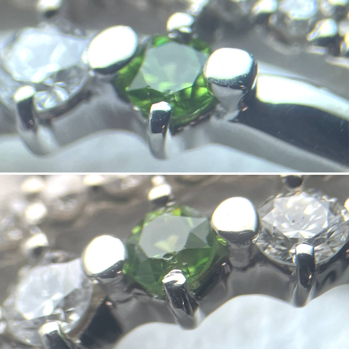 | Pt900デマントイドガーネットダイヤモンドリングの中古品です。 デマントイドガーネットはわずかに黄色味を帯びた緑色で、一部表面に欠けがあります。 また、一部にホーステイルが確認できます。 ダイヤモンドはわずかにインクルージョンがありますが、肉眼ではわかりません。 色は無色に近いです。 地金には小傷があります。