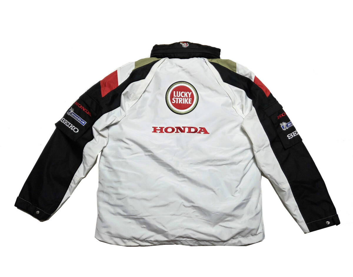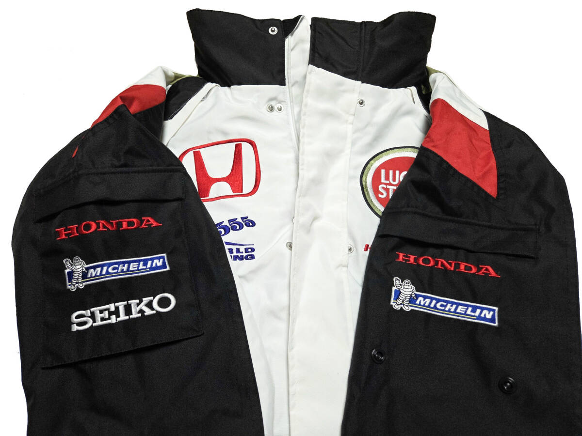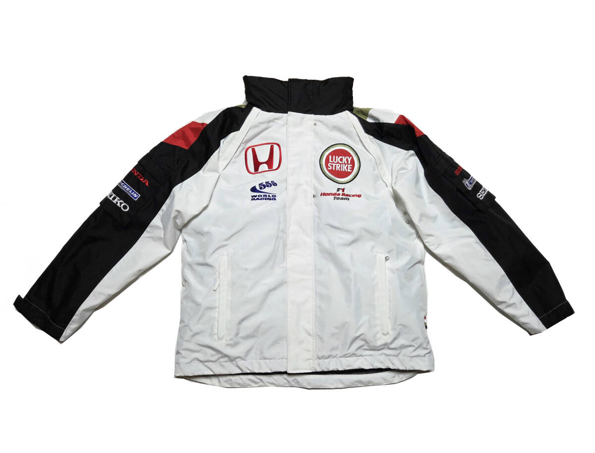 【商品の説明】 ホンダF1の2006支給品3wayヘビージャケットです。 インナーのベストは着脱可能で、ジャケットとベストそれぞれ単品として着用ができます。 こちらのジャケットはラッキーストライク仕様とレーシングレボリューション仕様にロゴが切り替え可能です。 ロゴの切り替えが可能な場所は全部で5箇所。 ・左胸:LS/RR ・右胸555ロゴの有無 ・両袖のSEIKOロゴ有無 ・背中:LS/RR 年間を通しての使用を想定されたロゴ切り替え式ジャケットは支給数も極少数になります。 当時も非常に珍しい存在でしたが、20年近く経過した現在では見掛ける事はほぼ皆無となっております。 状態:USED 小さい汚れはございますが、目立つような大きい汚れはございません。使用感自体も少なめで着用には全く問題の無いコンディションです。 表記サイズ・実寸:M ジャケット 身幅 63cm 着丈 73cm ベスト 身幅 60cm 着丈 65cm 注意事項:チームスタッフ専用に作られた支給品になり、一般販売される市販品のレプリカウェア等とは保管方法等が異なります。 状態を細かく気にされる方は入札をお控えください。 落札後はノークレームノーリターンでお願いします。 |