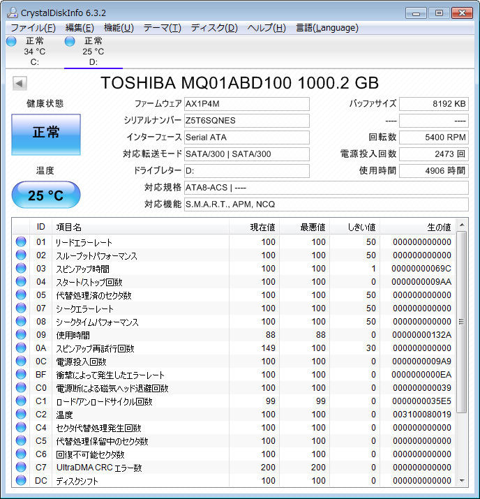 (SATA接続)1TB ノートPC用のハードディスク TOSHIBA MQ01ABD100 です。(^o^)