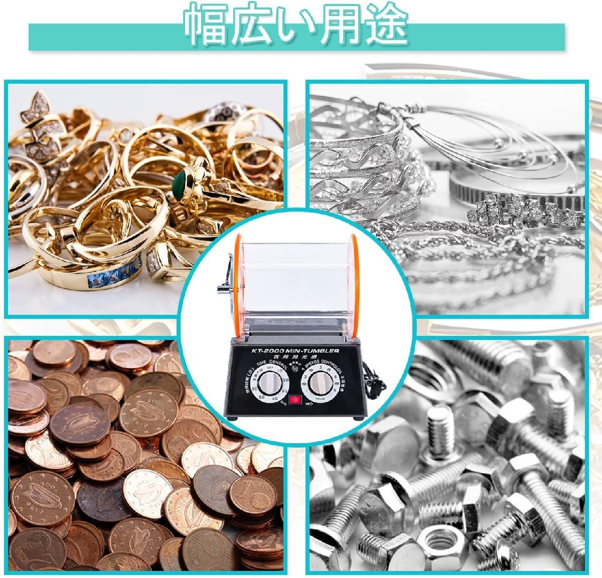 5kg大容量で効率的な仕上げ;ZruiXuan KT-2000 バレル研磨機は、5kgの容量を誇り、大量の部品やジュエリーの研磨に最適です。特に宝石や金属製品の表面仕上げにおいて、高い効率と均一な結果を実現します。