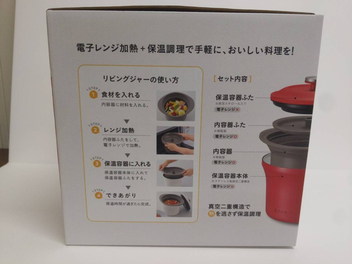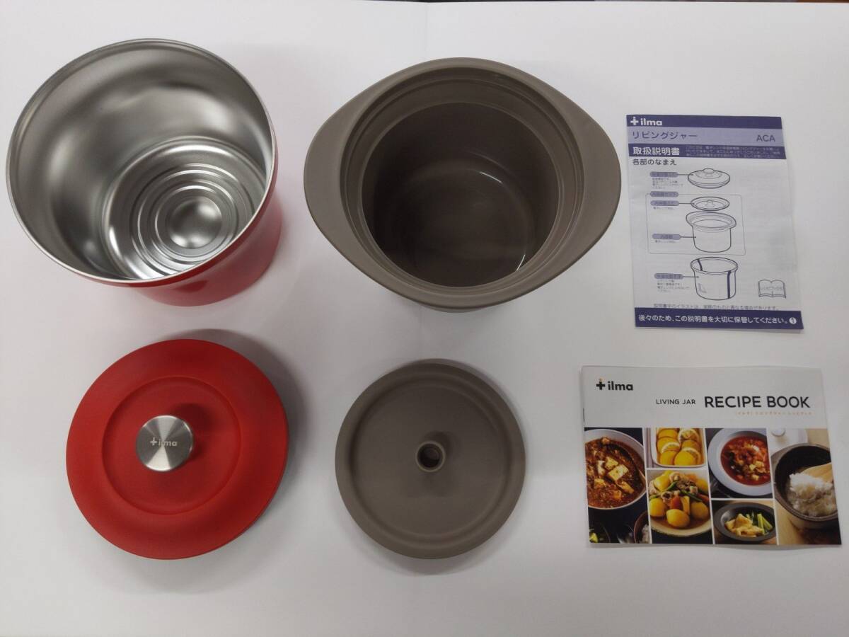 ・箱、保温容器本体、保温容器ふた、内容器、内容器ふた、取扱説明書、レシピブック。